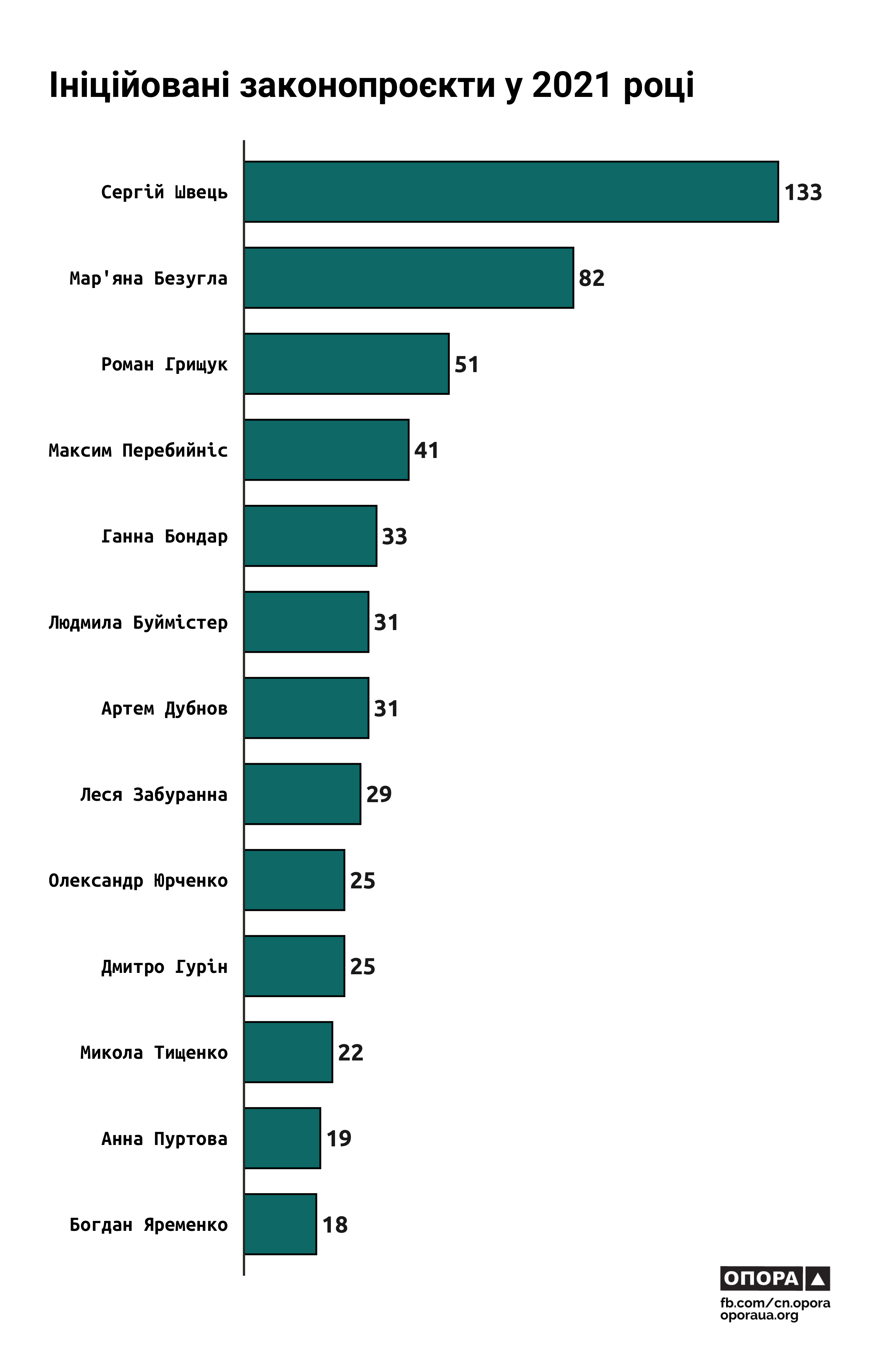 З-поміж усіх законопроєктів, авторами чи співавторами яких у 2021 році були народні депутати, що представляють Київ, лише 61 набув чинності і, відповідно, став законом. Найбільшу кількість законопроєктів запропонував Сергій Швець — 133, 12 із яких стали законами. Трішки менше законодавчих ініціатив надійшло від Мар’яни Безуглої — 82. Із них 18 підписані Президентом. Третім став Роман Грищук — 51 проєкт законів, 3 з яких набули чинності. Найменше законопроєктів подали Богдан Яременко та Анна Пуртова — 18 та 19 відповідно, але лише по одному з них стали законами. Разом з тим, жодна з 25 законодавчих ініціатив Дмитра Гуріна не була підписана Президентом.