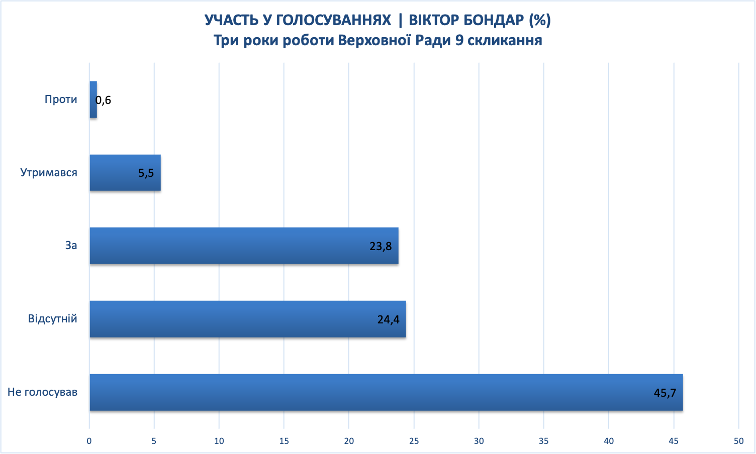 За три роки діяльності Верховної Ради 9 скликання в майже половині голосувань нардеп не брав участі, попри реєстрацію на засіданнях. Так, Віктор Бондар не голосував 5 892 рази (46%), ще під час 3 145 голосувань (24%) був відсутній. Кнопку «За» натискав 3 065 разів (24%), «Проти» – 73 рази (0,6). З початком великої війни народний обранець переважно голосує за пропоновані в парламенті рішення – 473 (55%). Не голосував, незважаючи на реєстрацію, у 232 випадках (27%).