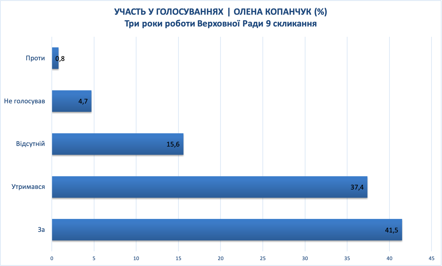 Олена Копанчук лідирує з-поміж мажоритарників від області за кількістю зареєстрованих протягом трьох років законопроєктів, їх у неї 151, 32 з яких уже підписано. Тематика законопроєктів депутатки стосується: