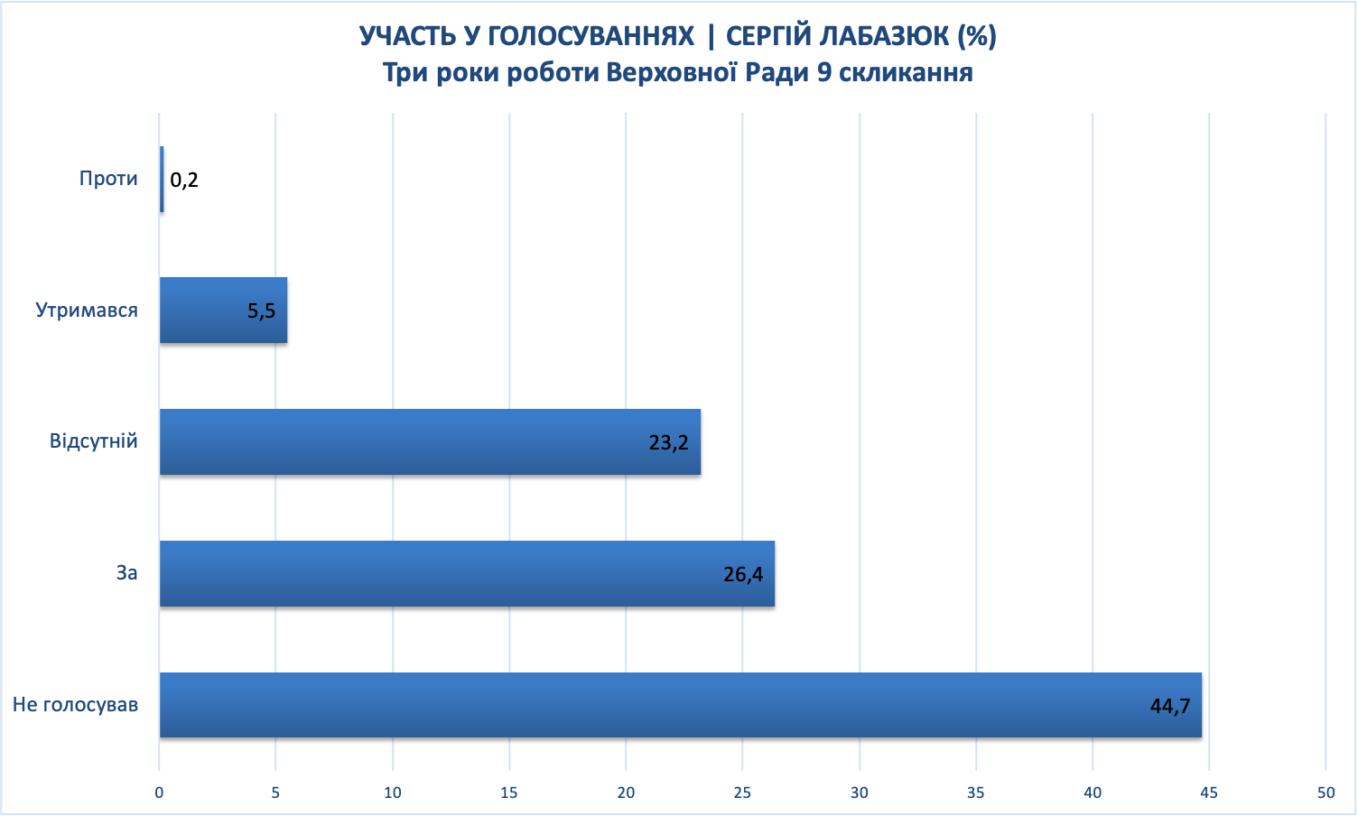 Від початку роботи у Верховній Раді ІХ скликання Сергій Лабазюк найчастіше не голосував. Попри реєстрацію у сесійній залі, нардеп не брав участі у 5 755 голосуваннях (45%). У 3 395 випадках (26%) він натискав кнопку «за», а «проти» голосував лише 29 разів (0,2%).