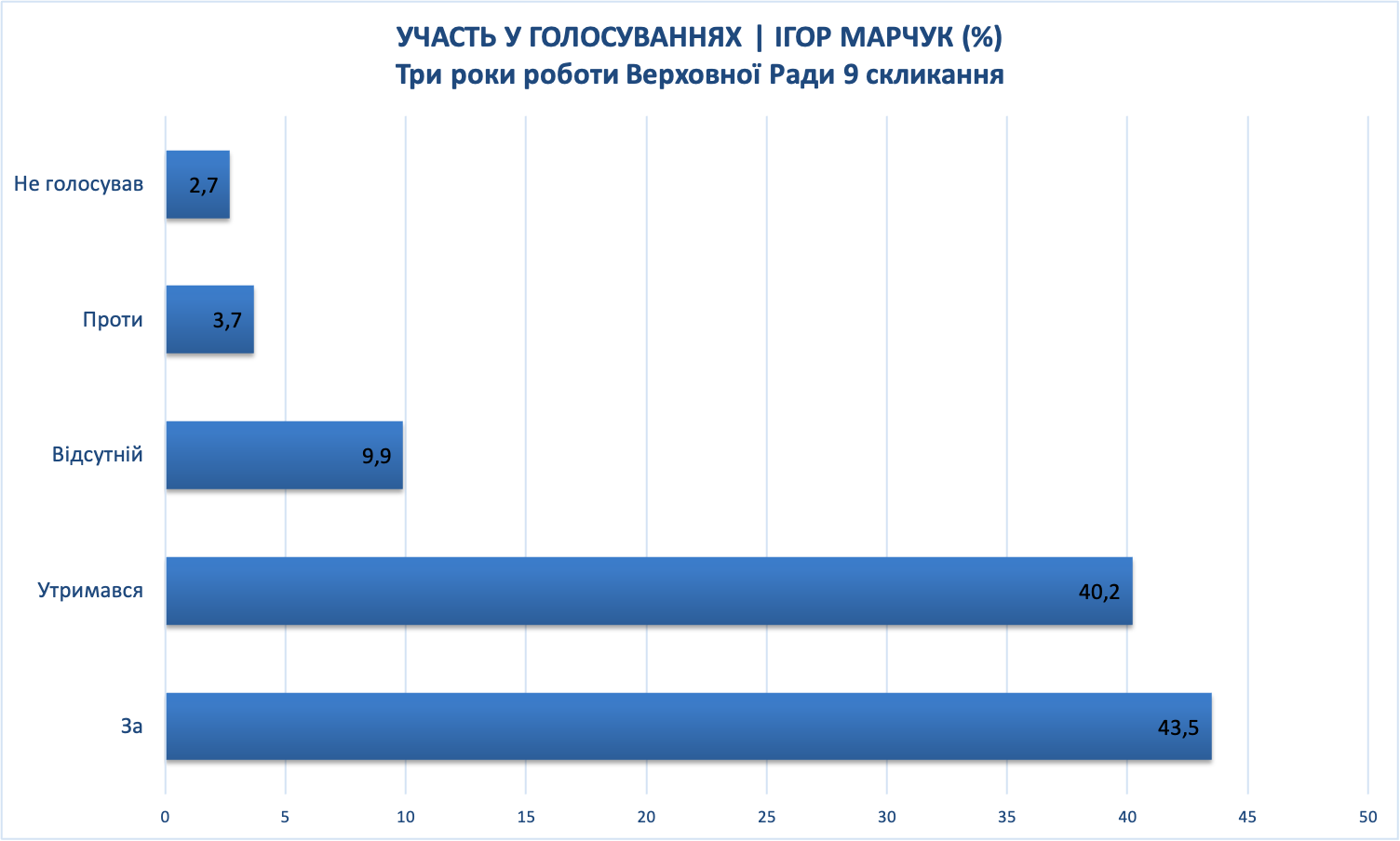 Голосування депутата після запровадження воєнного стану не вирізняються із загальної картини: 529 разів (62%) він не голосував, а 274 рази (32%) голосував «за».