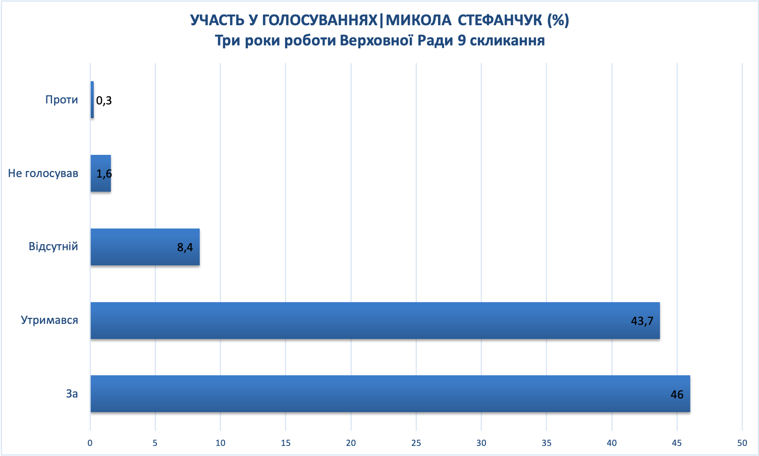 Упродовж трьох років роботи Ради 9 скликання Микола Стефанчук під час голосувань найчастіше обирав кнопку «за» — 5 887 разів (46%); 5 587 разів (44%) нардеп утримувався, а «проти» голосував лише 45 разів (0,3%).