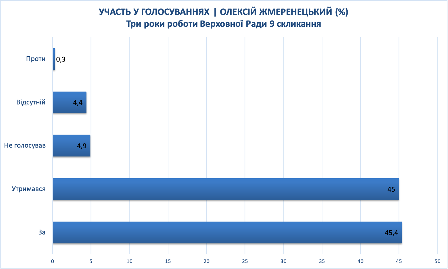 З початку роботи Ради 9 скликання Олексій Жмеренецький найчастіше або підтримує рішення, які ставлять на голосування, – 5 802 голосувань за (46%), або утримується – 5 748 (45%). Кнопку «Проти» за увесь час роботи в Раді нардеп натискав лише 40 разів. Після 24 лютого 2022 року Олексій Жмеренецький також здебільшого голосує за – 624 голосування (73%), або ж утримується – 169 голосувань (20%).