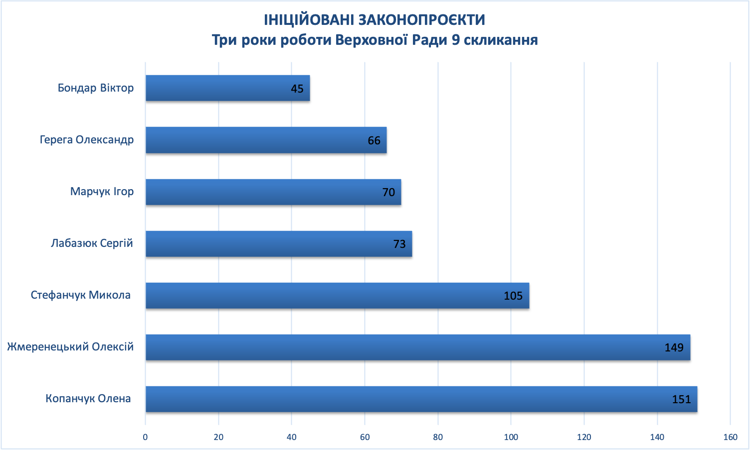 Упродовж трьох років роботи у Верховній Раді України ІХ скликання нардепи-мажоритарники від Хмельниччини долучилися до роботи над 500 законопроєктами. Лідеркою за кількістю законодавчих ініціатив стала Олена Копанчук, натомість Віктор Бондар найчастіше виступав у парламенті. Про це йдеться в дослідженні Громадянської мережі ОПОРА.