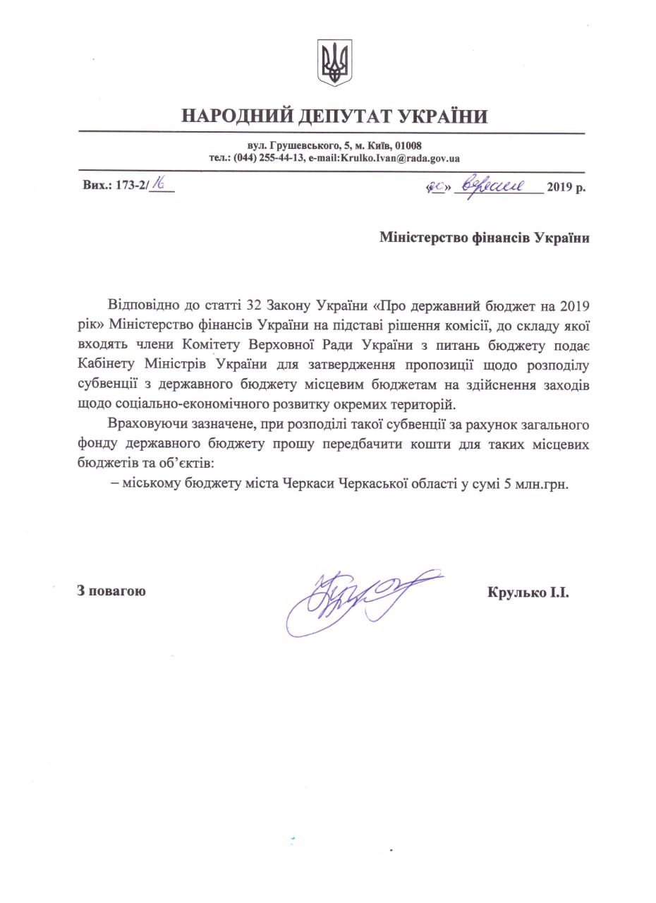 Після того, як таблиця з цифрами потрапила в мережу, у цьому ж телеграм-каналі з'явилася інформація, що народний депутат із “Батьківщини” Іван Крулько (навпроти прізвища якого стоїть сума у 185 мільйонів гривень) пояснив, що він робив запит лише на 5 мільйонів на Черкаси, а інші 180 мільйонів – це зібрані запити депутатів, які проходили через нього як заступника голови бюджетного комітету.