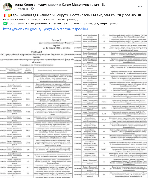 Про виділену Кабінетом Міністрів України субвенцію на соціально-економічний розвиток окремих територій Ірина Констанкевич повідомила 20 травня 2021 року на своїй сторінці у мережі Facebook.