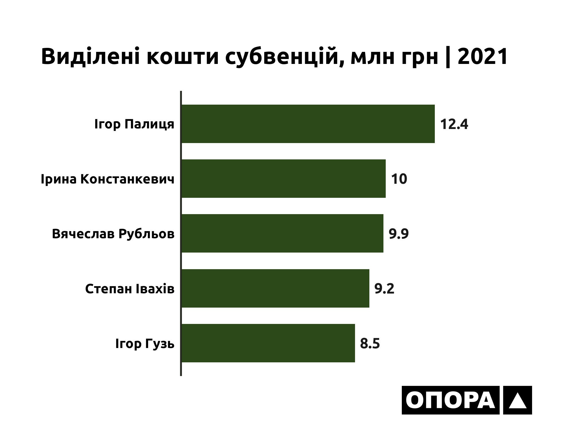 Зокрема, найбільшу суму коштів – 12 млн 432 тис. грн отримав виборчий округ №22 представника депутатської групи «Партія «За майбутнє» Ігоря Палиці. Водночас, найменшу суму коштів субвенції було спрямовано на виборчий округ №19, який представляє у парламенті Ігор Гузь (депутатська група «Партія «За майбутнє») – 8 млн 518 тис. грн.