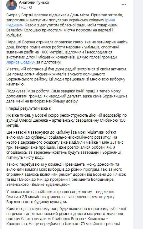 На округ №208 (у Верховній Раді його представляє Анатолій Гунько, член депутатської фракції політичної партії «Слуга народу») Кабінет Міністрів спрямував 12 млн гривень (20% від загальної субвенції на область) на 14 бюджетних проєктів. Народний депутат на своїй сторінці у Facebook 23 липня повідомив, що саме за його ініціативою Кабмін виділив другий транш субвенції на соціально-економічний розвиток громад округу. Щоправда у дописі йдеться про 13 субвенцій на 10 млн грн. Про виділення коштів Анатолій Гунько також заявив у соціальній мережі 18 вересня. Йдеться про реконструкцію чинного водозабору в м. Борзна. Нардеп зауважує, що саме з його ініціативи об’єкт включили до переліку на отримання субвенції соціально-економічного розвитку. На нього з державного бюджету вже виділили майже 1 млн 351 тис. грн.