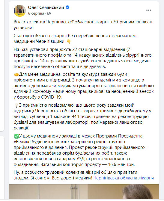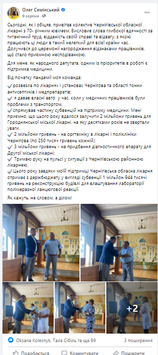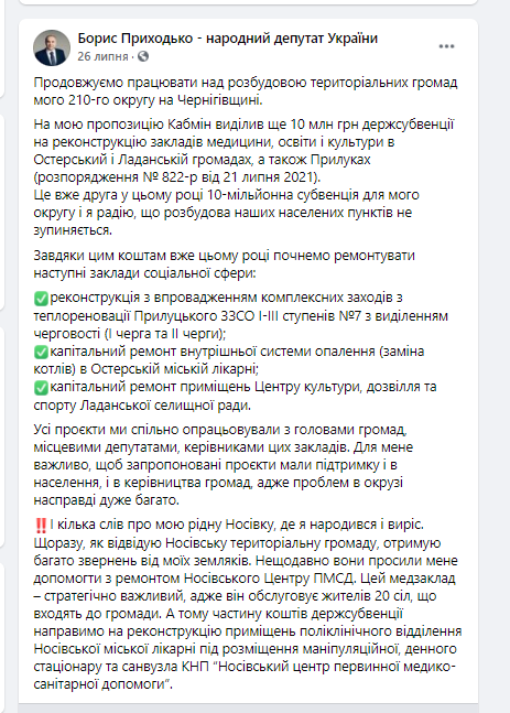 Про виділення коштів на своїй Facebook сторінці відзвітував народний депутат Борис Приходько (обраний по 210 ОВО, член депутатської групи «Довіра»). Народний обранець також зауважив, що саме на його пропозицію Кабмін виділив ще 10 млн грн держсубвенції на реконструкцію закладів медицини, освіти і культури в Остерський і Ладанській громадах, а також Прилуках. Не оминув увагою депутат і місто Носівку – зазначив, що частину коштів держсубвенції направить на реконструкцію приміщень поліклінічного відділення Носівської міської лікарні під розміщення маніпуляційної, денного стаціонару та санвузла КНП «Носівський центр первинної медико-санітарної допомоги». Хоч Носівка й входить до округу 209, а не його 210-го.