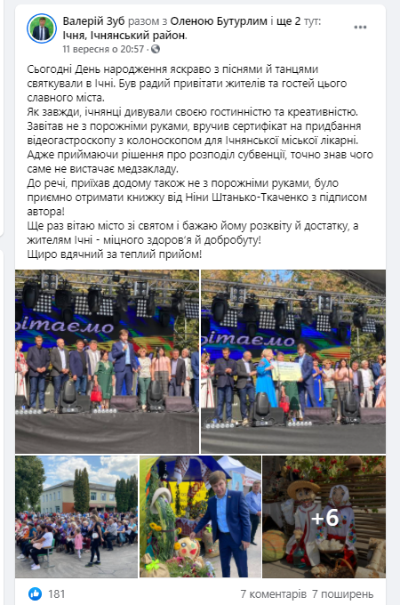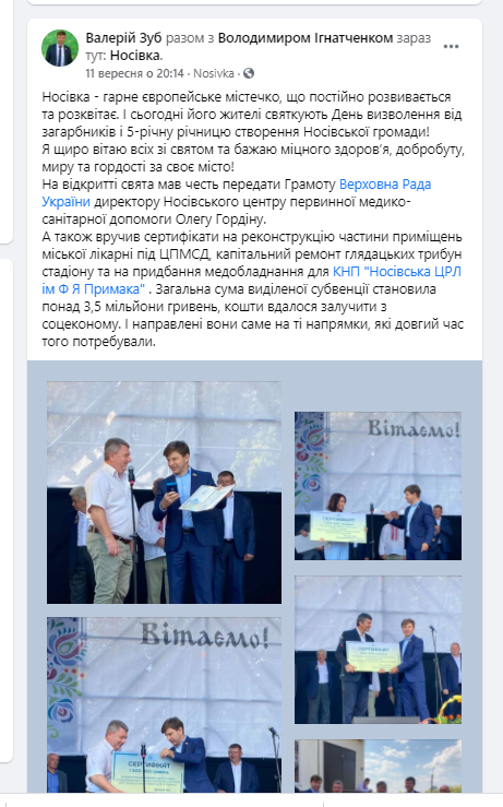 Про вручення сертифікату на придбання відеогастроскопу з колоноскопом для Ічнянської міської лікарні Валерій Зуб 11 вересня відзвітував на своїй сторінці у Facebook. Депутат зауважив, що при розподілі субвенцій точно знав, що потрібно саме цій лікарні. А також про те, що вручив сертифікати на реконструкцію частини приміщень міської лікарні Носівки під ЦПМСД, капітальний ремонт глядацьких трибун стадіону та на придбання медобладнання для КНП «Носівська ЦРЛ ім. Ф.Я. Примака». «Загальна сума виділеної субвенції становила понад 3,5 мільйони гривень, кошти вдалося залучити з соцеконому. І направлені вони саме на ті напрямки, які довгий час того потребували», – підкреслив народний обранець.