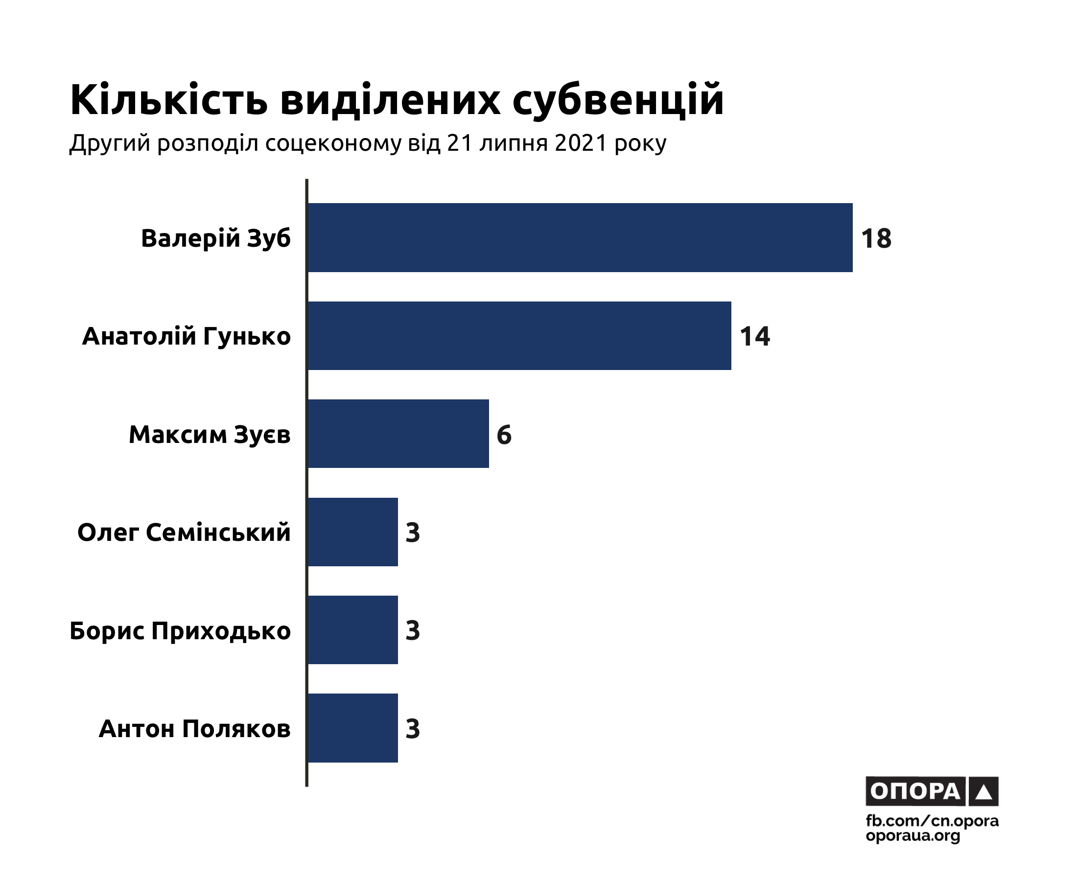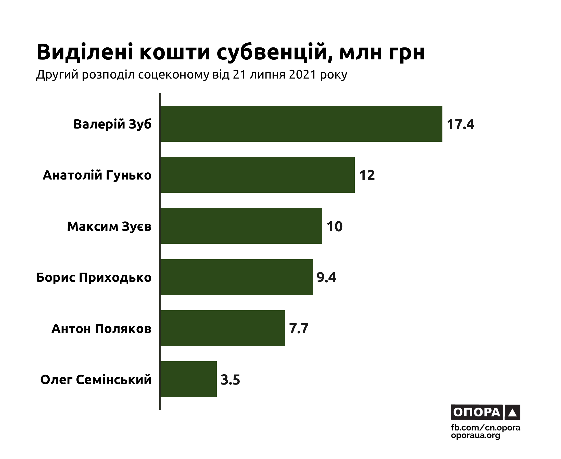 Щодо округу №207 (у Верховній Раді IX скликання його представляє Максим Зуєв, фракція партії «Слуга народу»), то він отримав 6 субвенцій на 10 млн грн. Їх витратять на такі напрямки: