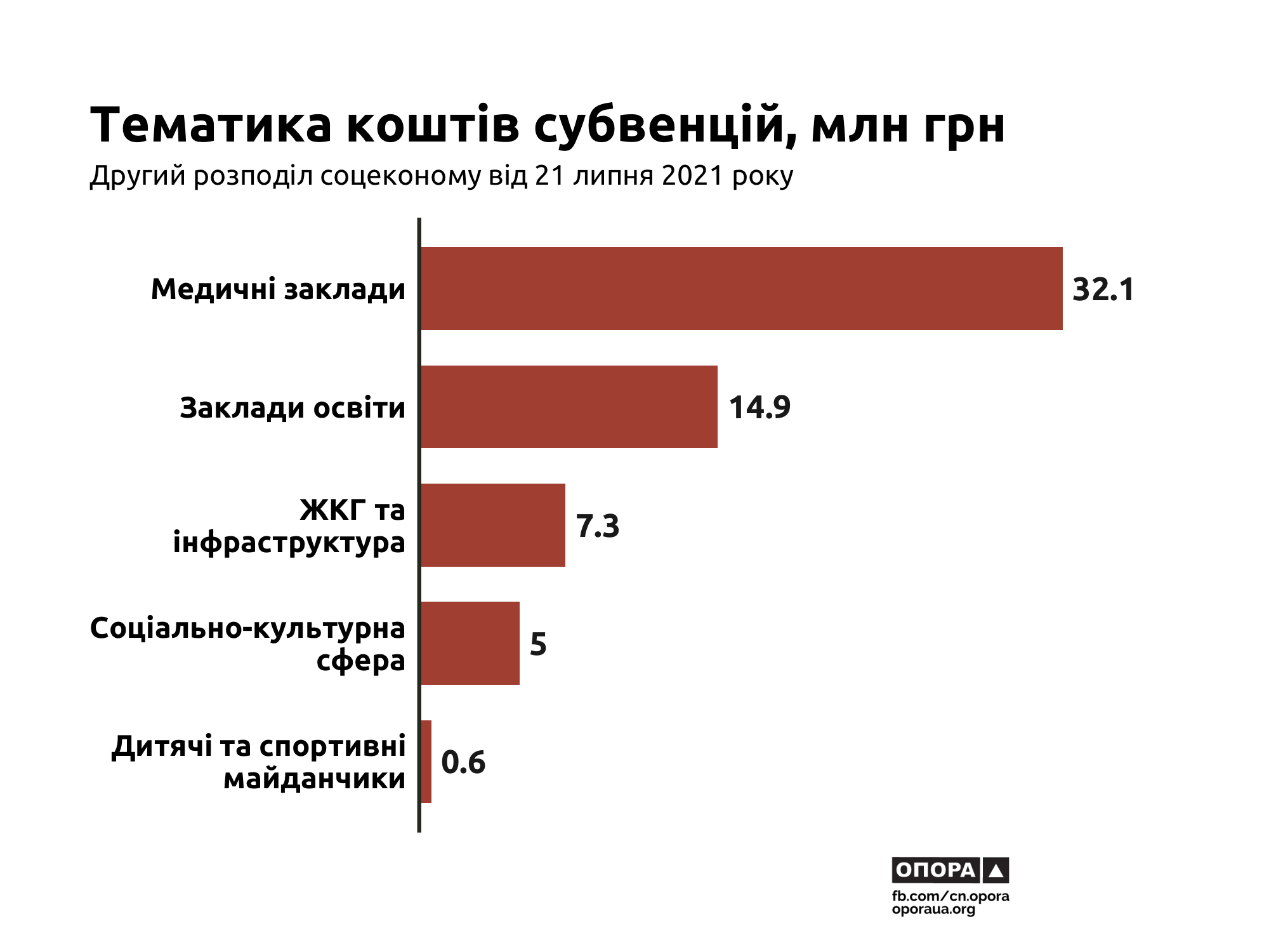 Як і під час першого розподілу коштів, на медичні заклади припало найбільше субвенцій – 21 із 47 загалом. Це обійдеться платникам податків у 32 млн грн, або 53,5% від загальної кількості коштів. На заклади освіти спрямують 12 субвенцій загальною вартістю 13,6 млн грн (22,7%). Сфера ЖКГ та інфраструктури отримала 11 субвенцій. У грошовому еквіваленті це складає 8,6 млн грн (14,4% відповідно). Дві субвенції виділили на дитячі та спортивні майданчики. Загальна вартість – трохи більше 628 тис. грн (1,1%). Лише одна субвенція припала на соціально-культурну сферу, але вартістю 5 млн грн, що складає 8,3% від загальної суми субвенції. На ремонт доріг субвенції на Чернігівщині у 2021 році не передбачені.