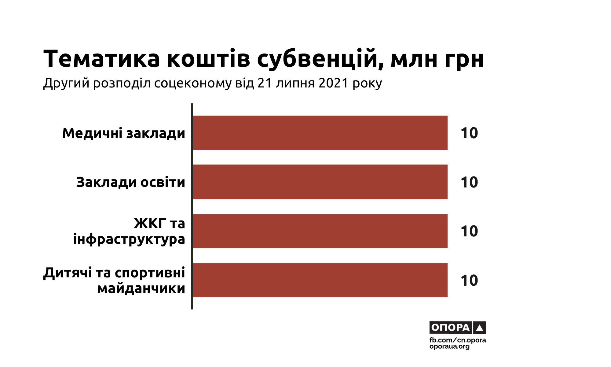 Приміром найбільшу кількість субвенцій отримали Львівська область (119 субвенцій), Волинська (117) та Харківська (83). Якщо ж дивитися на суми субвенцій, а отже й масштабність втілених проєктів, то на першому місті Дніпропетровська область (отримала 180 мільйонів гривень), Харківська (108,2 мільйона гривень) та Київ (102,2 мільйона гривень).