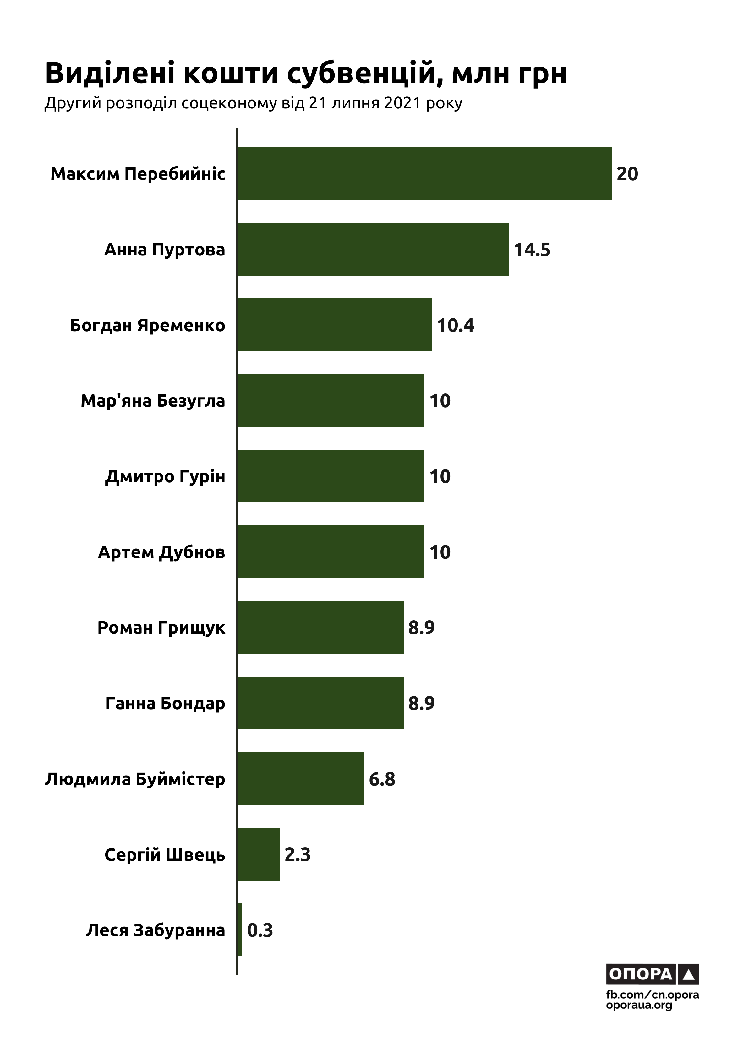 У підсумку розподілу лідером за сумою отриманих субвенцій є виборчий округ №212, який у Верховній Раді представляє Максим Перебийніс. На соціально-економічний розвиток тамтешньої громади, цьогоріч спрямували 20 млн грн. Виділені кошти підуть на капітальний ремонт фасадів дошкільних навчальних закладів №149 та №242, кожна з установ отримає по 10 млн грн.