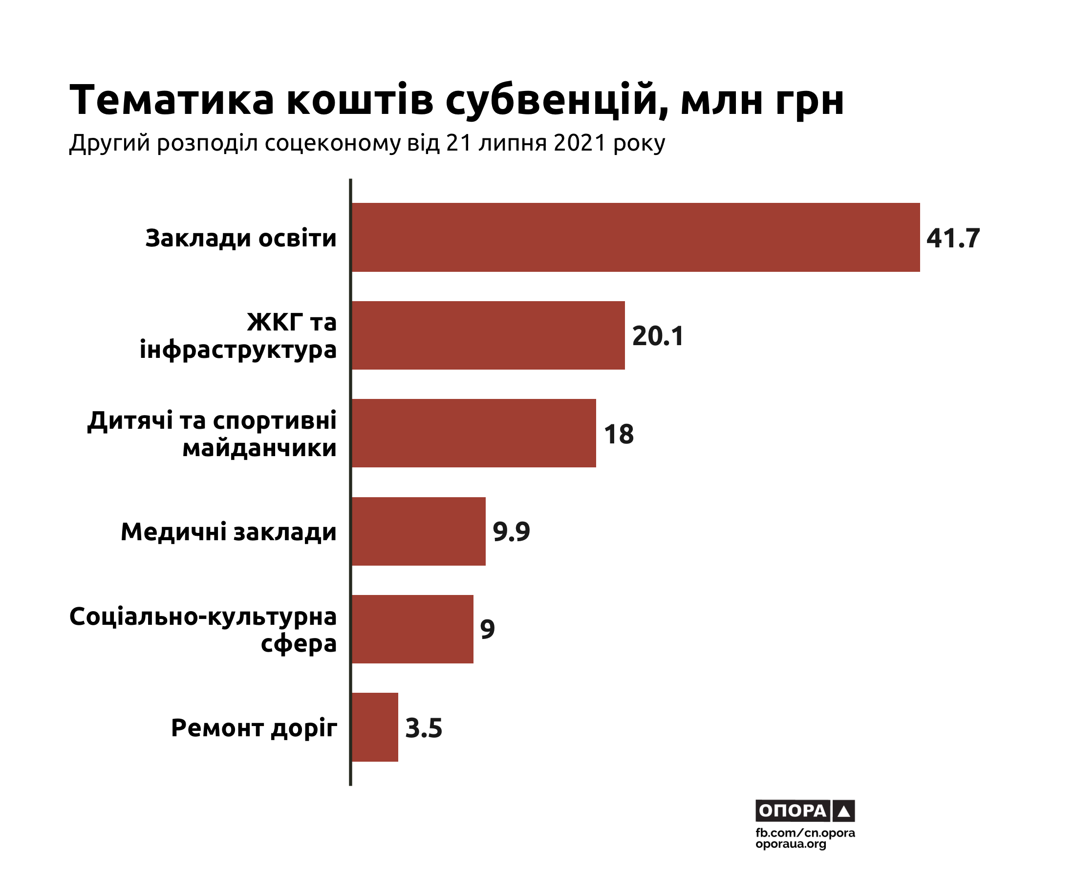 Відповідно до розпорядження Кабміну від 21 липня 2021 року №822-р найбільша сума коштів була направлена для розв'язання проблемних питань у закладах освіти – 40,8% (понад 41,7 млн). На другому місці сфера ЖКГ та розвиток інфраструктури 19,6% (20,05 млн). Ще 18 млн грн пішло на дитячі та спортивні майданчики. Найменшу суму коштів було направлено на ремонти доріг – 3,4% (3,5 млн).