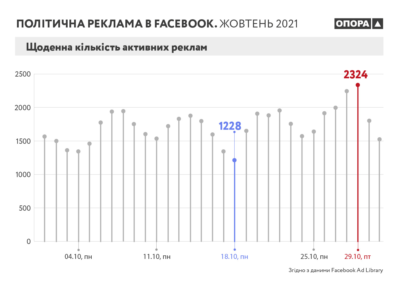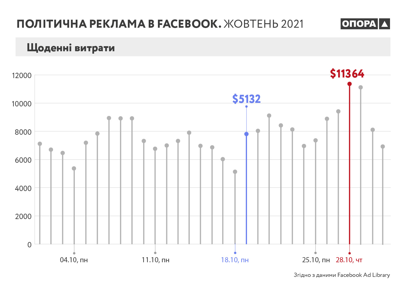 У жовтні витрати на просування в соціальній мережі Facebook та Instagram завдяки інструменту політичної реклами зросли порівняно з вереснем і становлять від 268 223 до 376 034 доларів*. Загалом рекламні публікації політичного контексту протягом місяця транслювалися на 1244 сторінках українських політиків та партій, а також дотичних до політики акаунтів. Серед усіх публікацій 7,6%  не були марковані як політична реклама, чим порушували правила Facebook і були заблоковані.