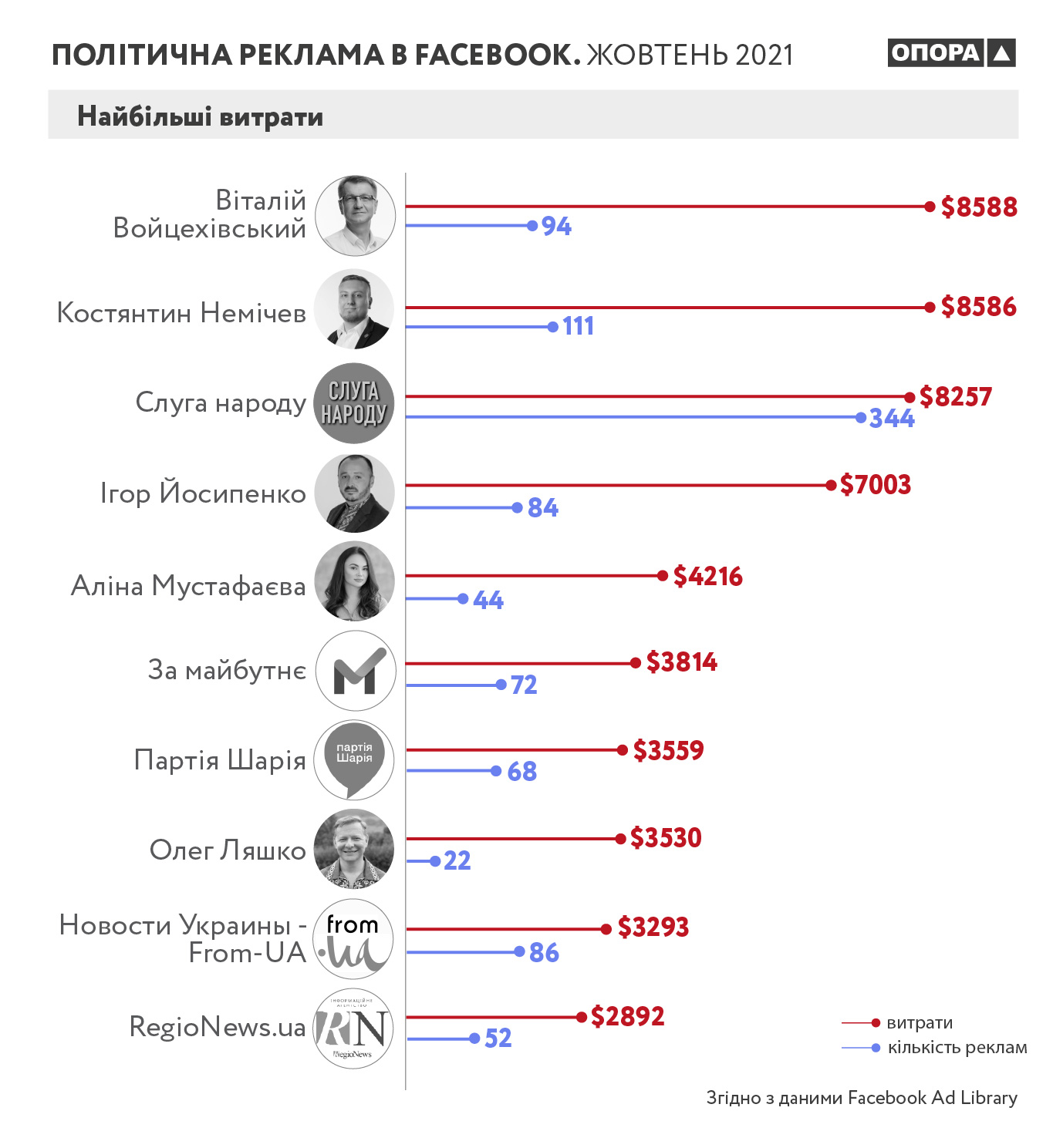 Майже однакові суми інвестували в жовтні в передвиборчу агітацію на своїх сторінках кандидат від партії “Слуга народу” на Черкащині Віталій Войцехівський та кандидат на посаду харківського міського голови самовисуванець Костянтин Немічев — по 8588$ та 8586$ відповідно. Щоправда, відповідно до попередніх результатів голосування (за даними ОВК №197 та Харківської міської ТВК), перемогу на виборах здобув лише Войцехівський.