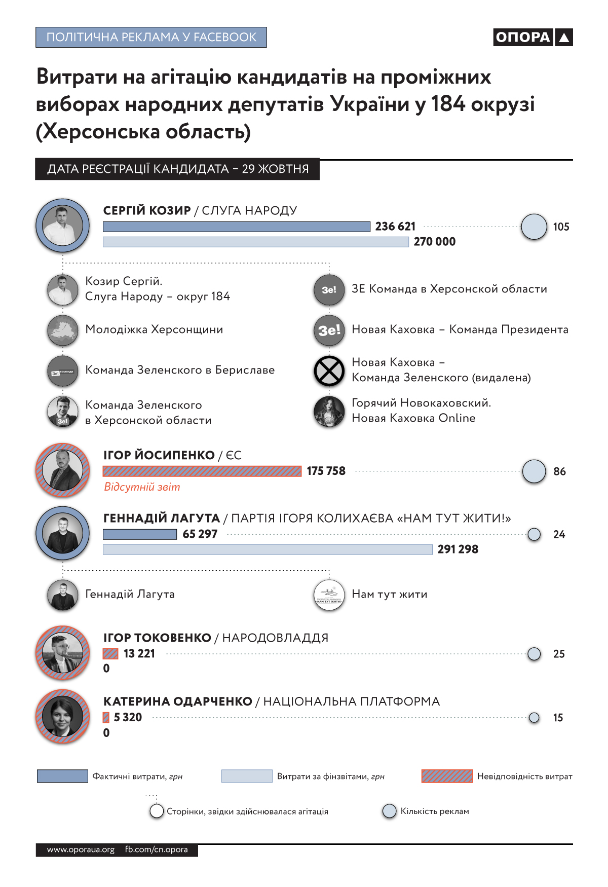 Серед кандидатів у 184 окрузі Facebook-рекламу використовували Геннадій Лагута (партія Ігоря Колихаєва “Нам тут жити”), Ігор Йосипенко (“Європейська солідарність”), Катерина Одарченко (“Національна платформа”), Сергій Козир (“Слуга народу”) та Ігор Токовенко (“Народовладдя”). Остаточні фінансові звіти всіх цих кандидатів опубліковані на сайті ЦВК.