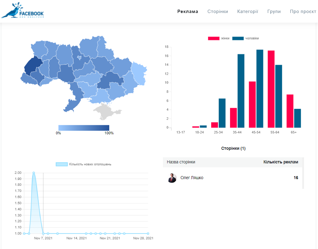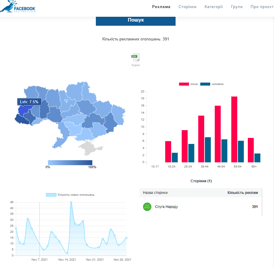 Найбільше рекламних публікацій у листопаді вийшло на сторінці партії “Слуга народу” — 450 дописів, на просування яких було витрачено майже 8 тисяч доларів США. Діджитал-комунікація — традиційна для цієї партії: її офіційна сторінка часто публікує рекламні повідомлення, в яких ідеться про позиції партійців щодо політичних питань та законодавчих ініціатив. Також там публікують анонси програм за участі представників партій, розповіді про представників місцевої влади тощо. Найбільше показів цих реклам відбулося для користувачів із Закарпатської та Львівської областей, причому значна перевага була за жіночою аудиторією.