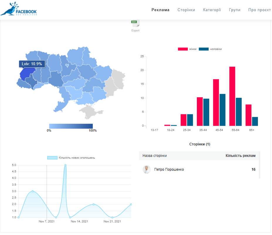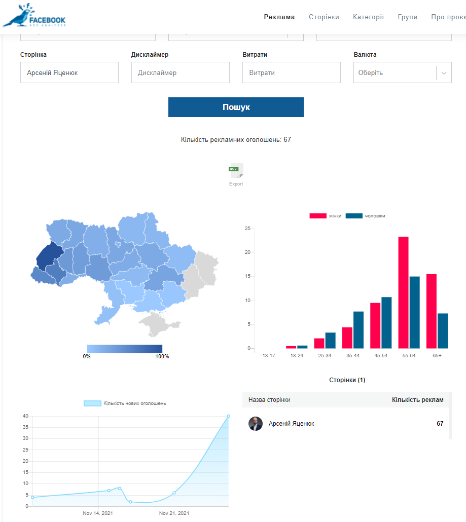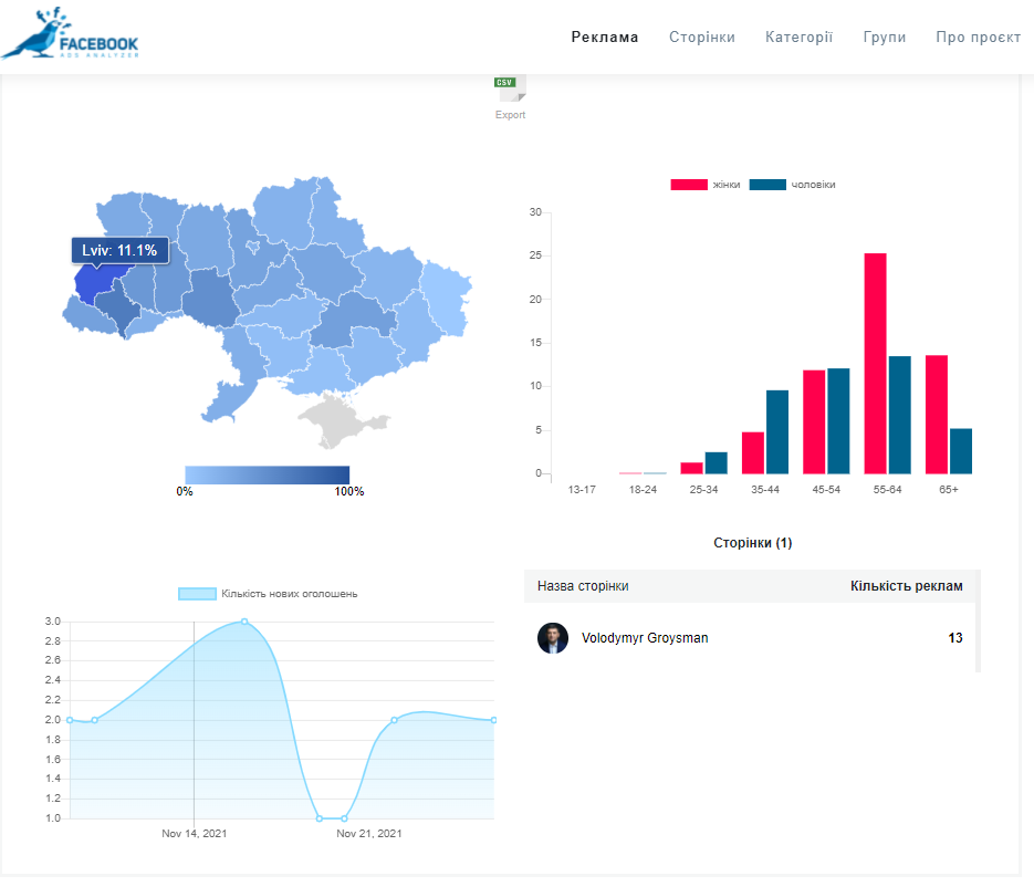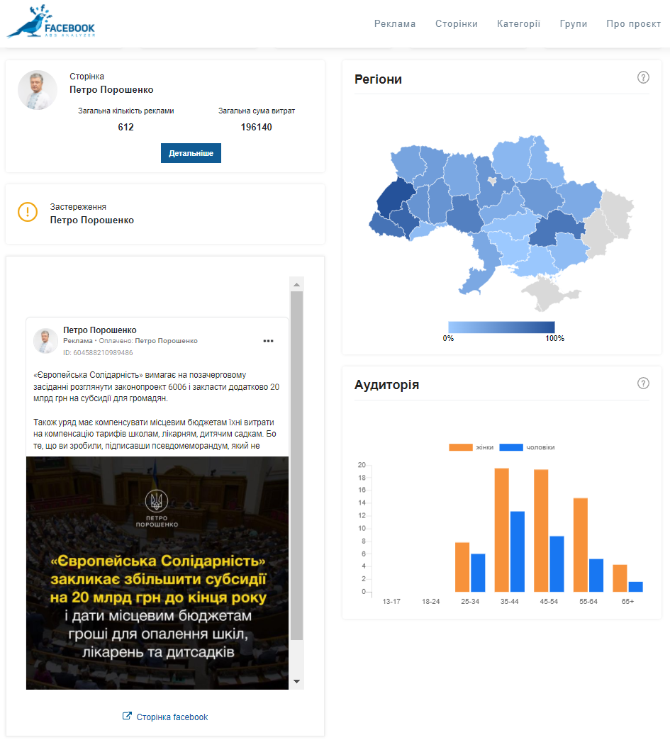 На сторінках Яценюка, Порошенка і Гройсмана таргетинг дуже схожий — пріоритетними для показу рекламних повідомлень були жителі Львівщини. Рекламу на сторінках двох перших політиків не демонстрували жителям Донецької та Луганської областей.