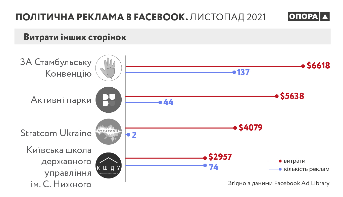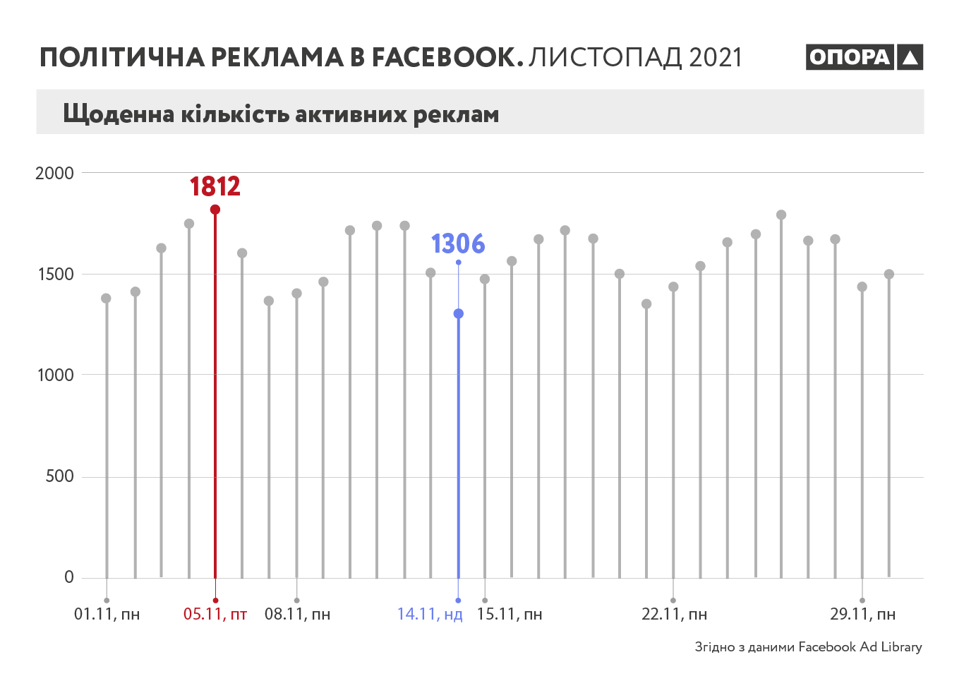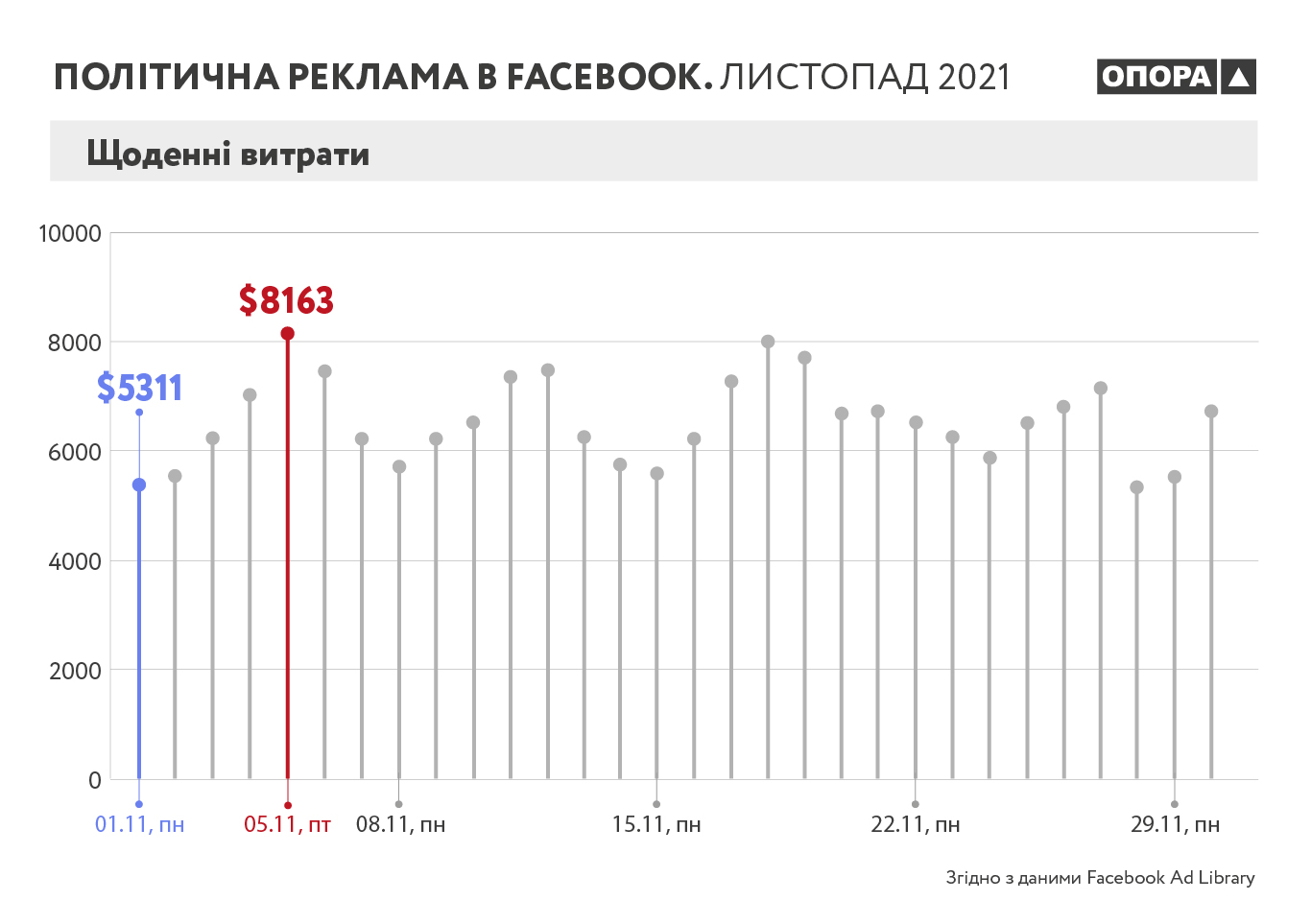 Загалом у листопаді в соціальних мережах Facebook та Instagram для української аудиторії транслювалося 11,5 тисяч рекламних публікацій політичного змісту. На їх просування на 1492 сторінках було витрачено від 203 432 до 321 638* доларів США. Порушували правила Facebook і були заблоковані 7,68% публікацій, що не були не промарковані як політична реклама.