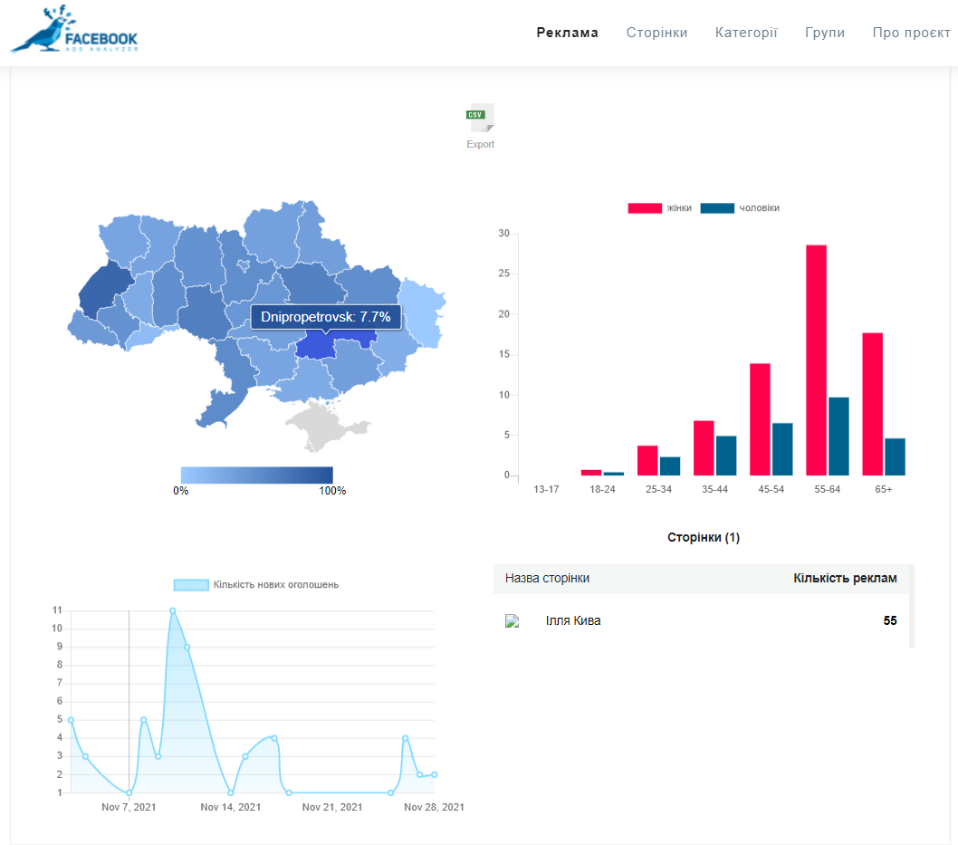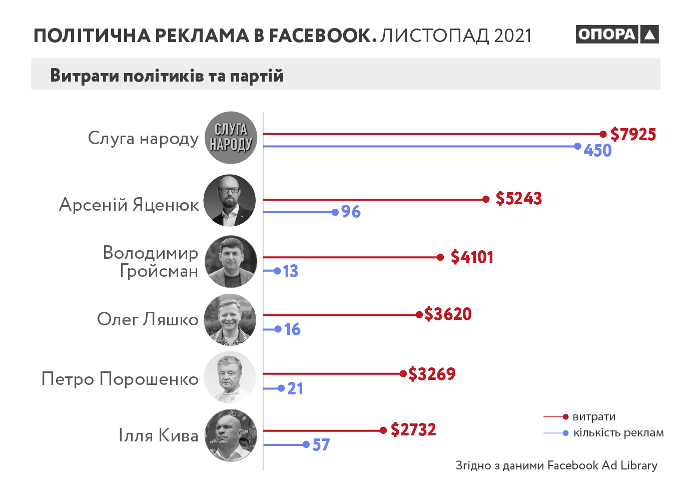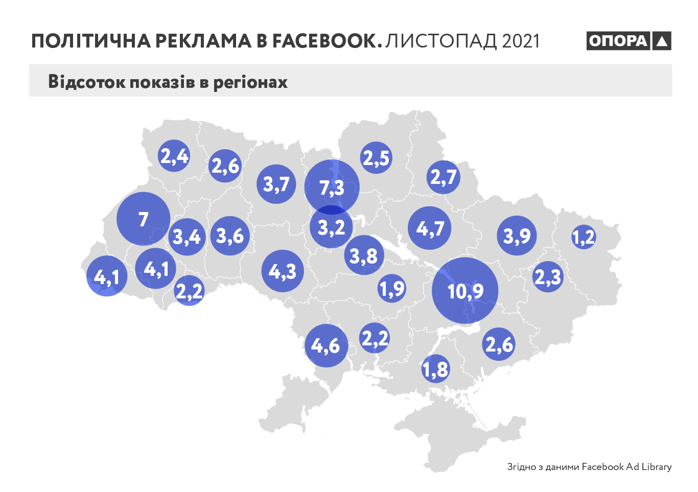 Загалом у листопаді в соціальних мережах Facebook та Instagram для української аудиторії транслювалося 11,5 тисяч рекламних публікацій політичного змісту. На їх просування на 1492 сторінках було витрачено від 203 432 до 321 638* доларів США. Порушували правила Facebook і були заблоковані 7,68% публікацій, що не були не промарковані як політична реклама.