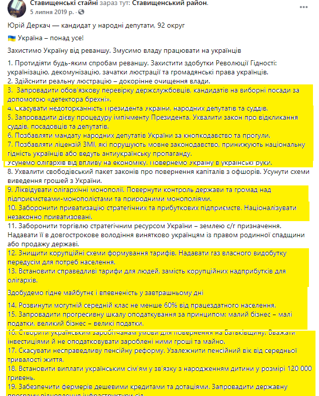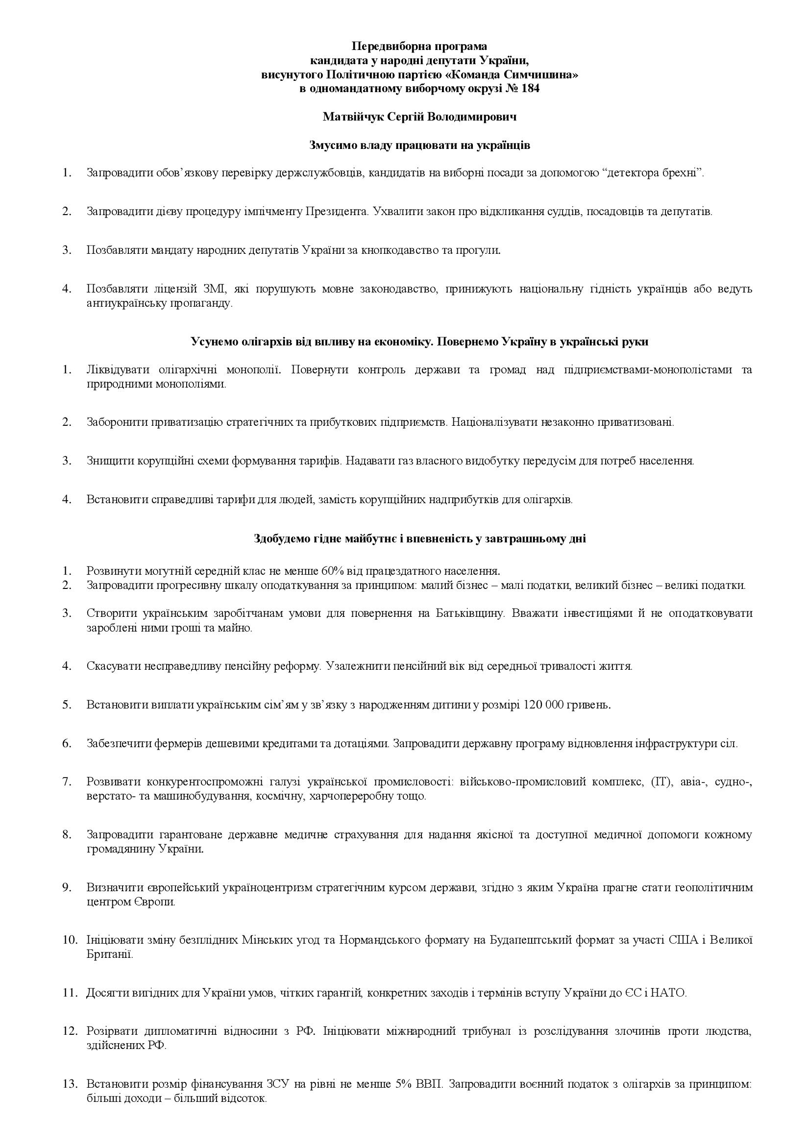 Програма кандидата у народні депутати від партії «Команда Симчишина» Сергія Матвійчука складена з пунктів програми кандидата від ВО «Свобода» по округу 92 у 2019 році Юрія Деркача.