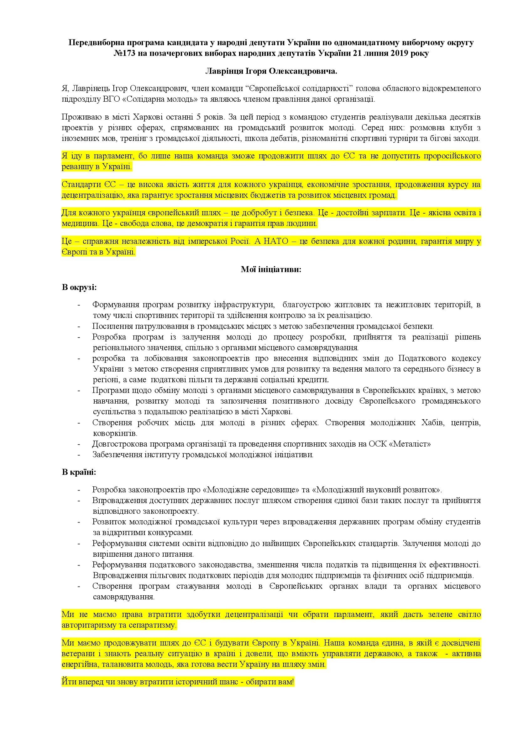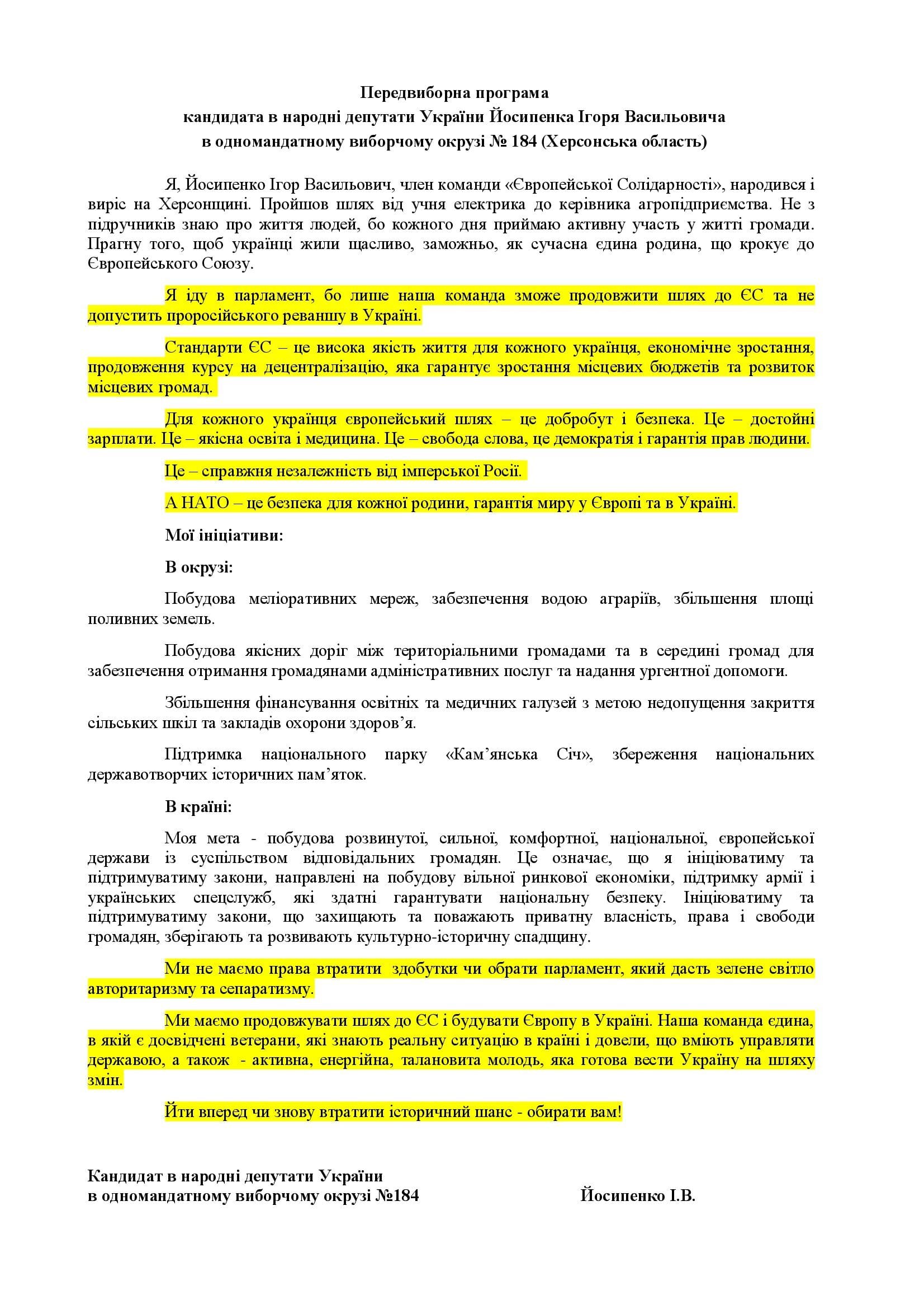 Так, наприклад, частини тексту передвиборчої програми кандидата від «Європейської солідарності» Ігор Йосипенко повторюють програму кандидата у народні депутати Ігоря Лаврінця, який також від партії «Європейська солідарність» балотувався по округу №173 на позачергових виборах 21 липня 2019 року. Зокрема, повторюються фрази про європейський шлях, побудову Європи в Україні та НАТО, як гарантію миру в Україні.