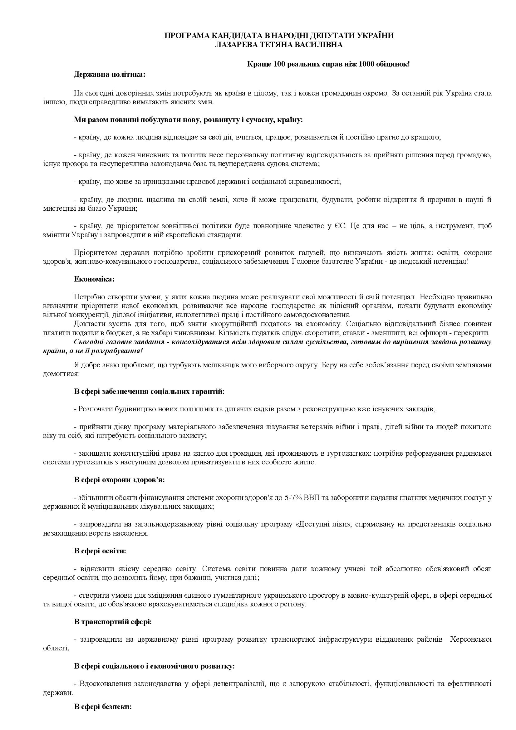 Програма кандидатки від партії «Миколаївці» Тетяни Лазаревої майже слово у слово повторює програму кандидата Геннадія Чекіти. Лише замінено згадки Одеси на Херсон. Чекіта є керівником партії «Миколаївці».