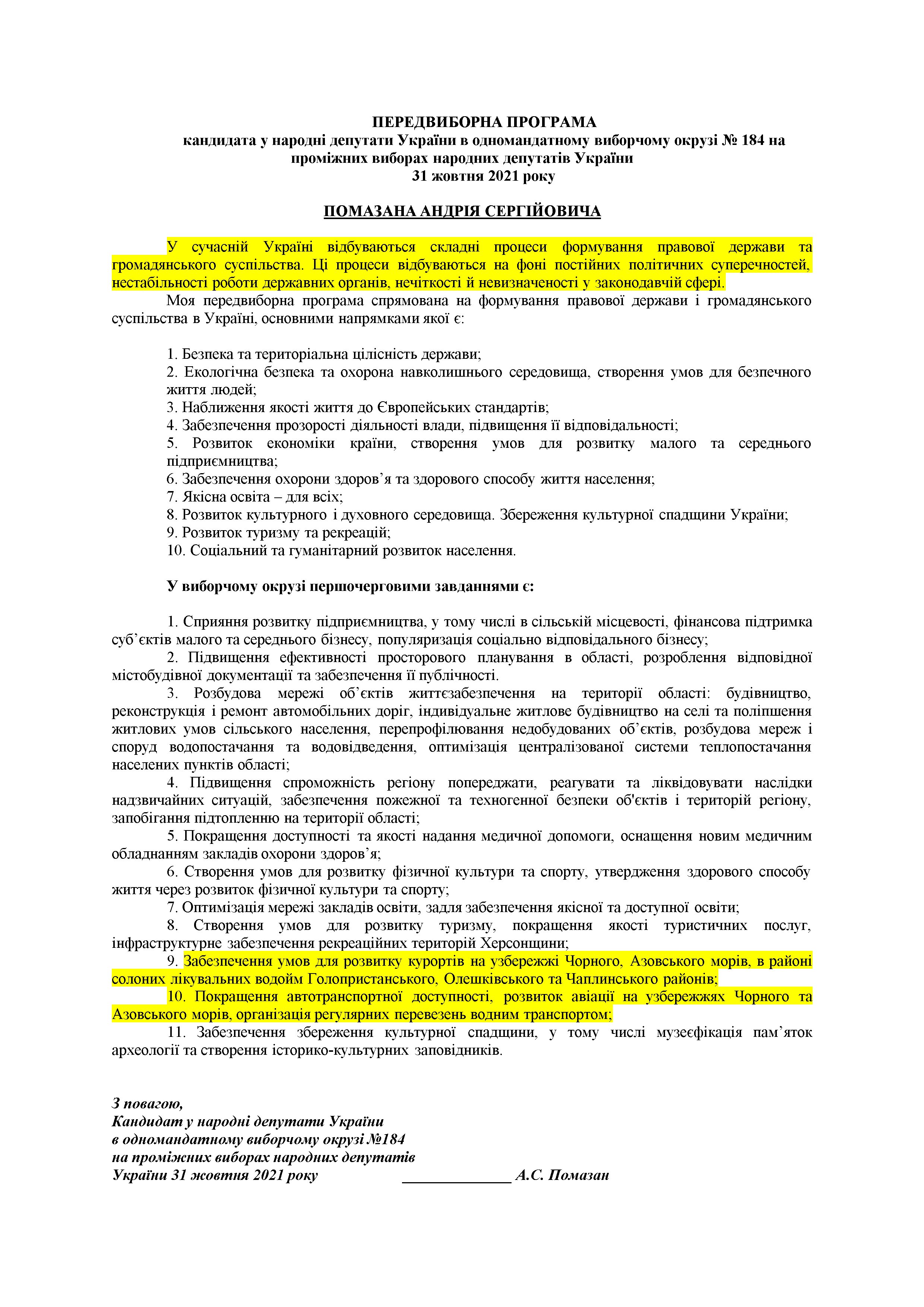 Кандидат від партії «Нові обличчя» Андрій Помазан свою програму сформував, використовуючи матеріал «Актуальні проблеми організації громадянського суспільства в Україні», авторами якого зазначені викладач та студент Національної академії внутрішніх справ, а також окремі пункти проєкту Стратегії розвитку Херсонської області на період 2021-2021 років в частині розвитку курортів на узбережжі Чорного та Азовського морів.