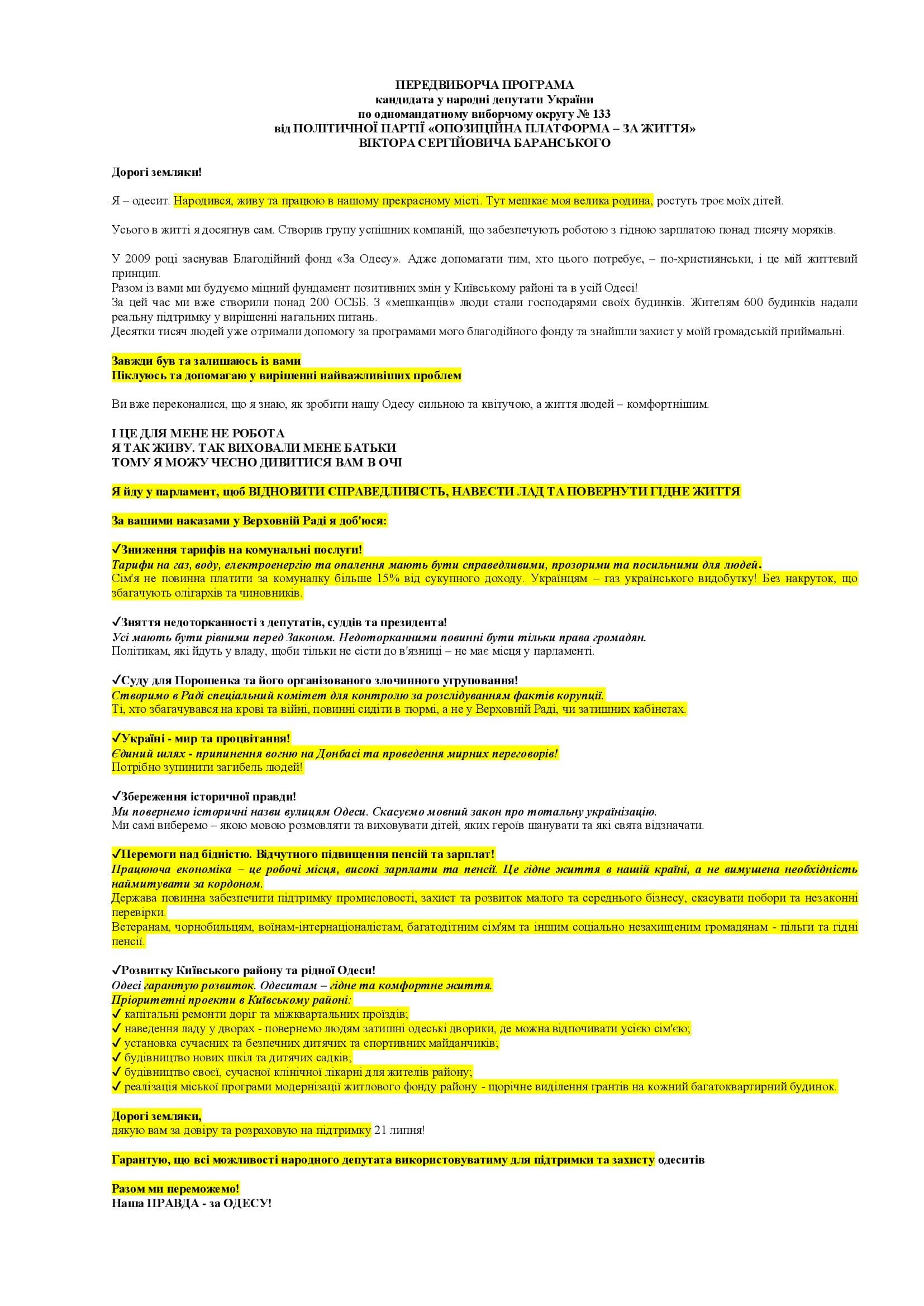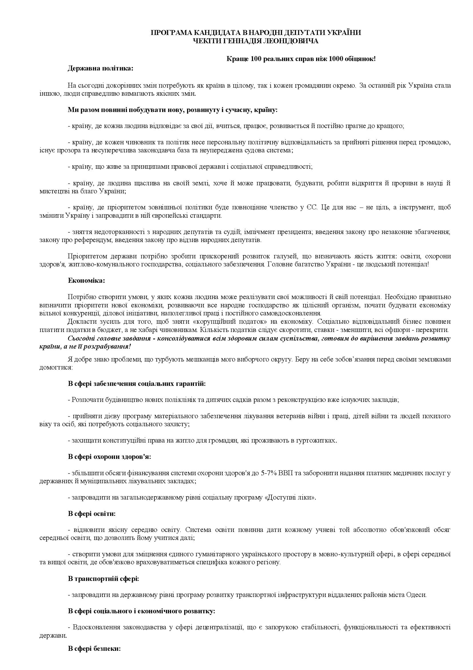 Відповідно до частини 3 статті 55 Закону України “Про вибори народних депутатів”, для реєстрації народного кандидата серед інших документів подається в електронному вигляді передвиборна програма, викладена державною мовою, яка оприлюднюється на офіційному веб-сайті Центральної виборчої комісії.
