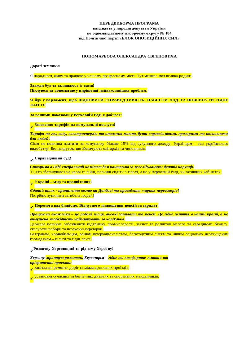 Програма кандидата від партії «Блок опозиційних сил» Олександра Пономарьова майже повністю повторює програму кандидата у нардепи від партії «Опозиційна платформа – За життя» Віктора Баранського, який балотувався 21 липня на окрузі №133. Слова «Одеса, одесити» замінені на «Херсон, херсонці». Пономарьов не включав у свою програму пункти Баранського про повернення історичних назв вулицям та скасування «мовного закону про тотальну українізацію», а також про зняття недоторканності з депутатів, суддів та Президента. Пункт «Суду для Порошенка» замінено на «Справедливий суд».