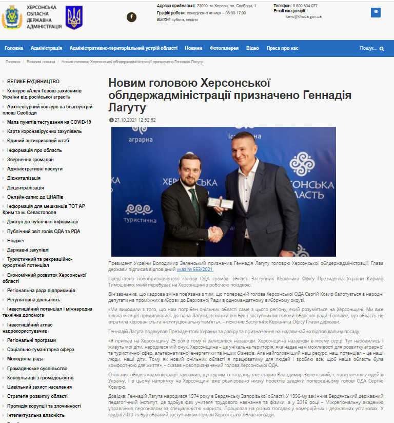 На сайті Херсонської облдержадміністрації з’явилась новина про призначення Лагути, де зазначається, що нового голову ОДА призначено у зв’язку з тим, що на окрузі балотується Сергій Козир.