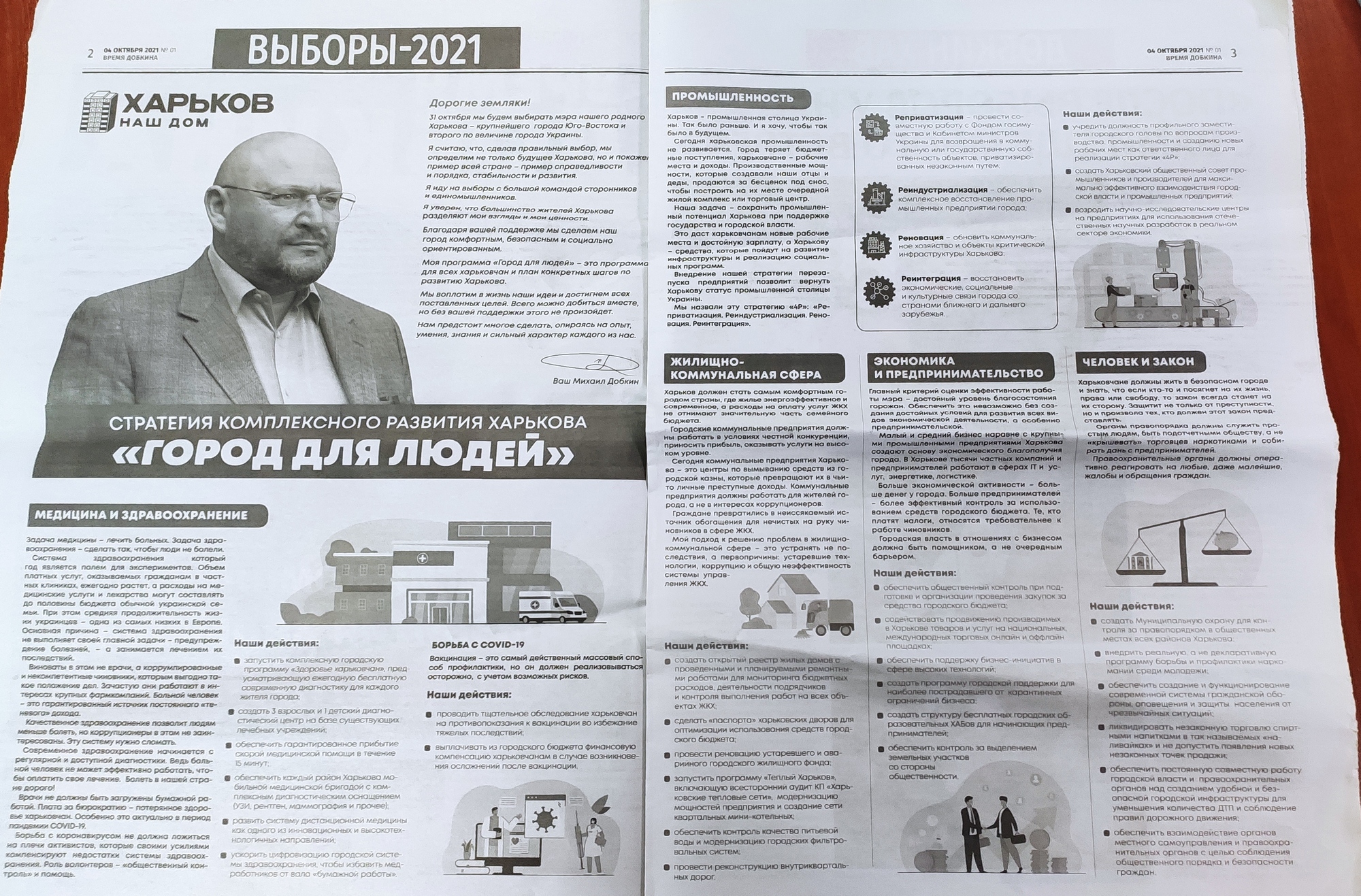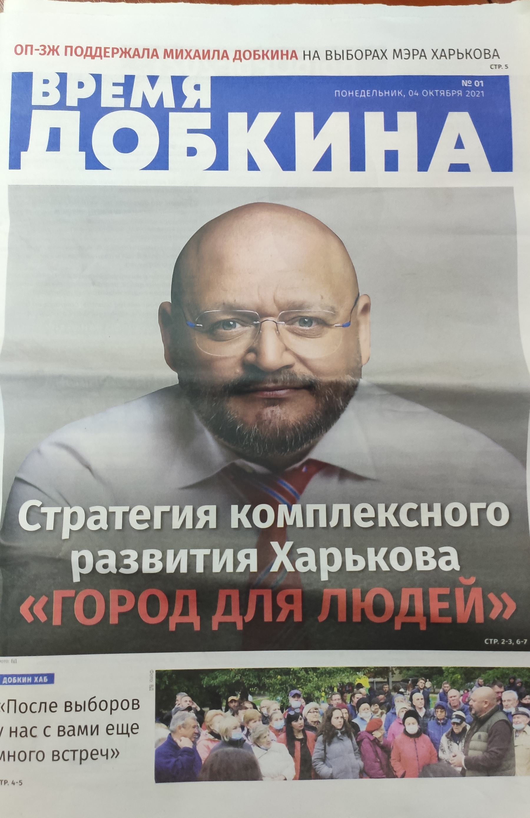У жовтні в Харкові біля виходів станцій метро безкоштовно роздавали випуск газети «Время Добкина» від 4 жовтня. Спостерігачі ОПОРИ фіксують роздавання вже протягом двох тижнів. До офіційної реєстрації Добкіна кандидатом у міські голови засновником газети «Время Добкина» була ГО «Наш Дім Харків».