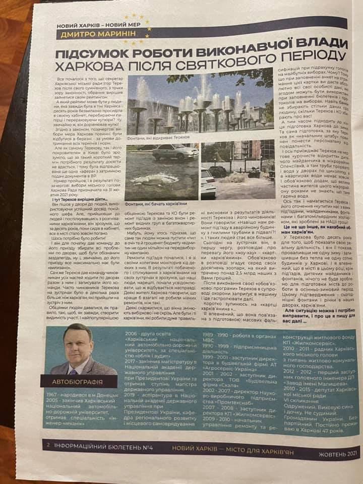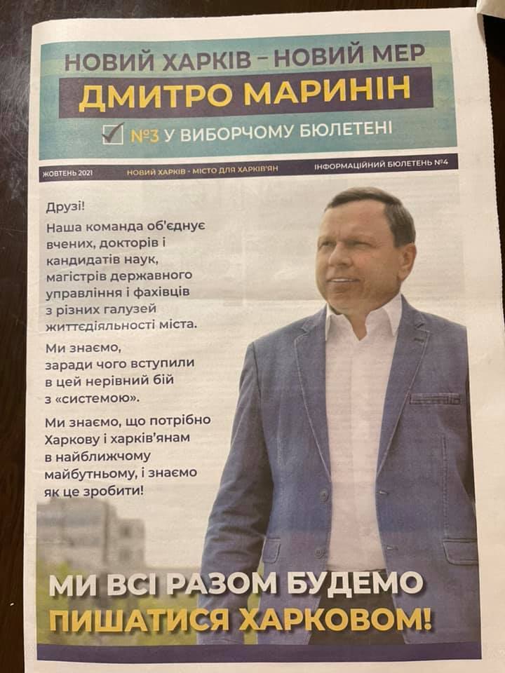 Крім того, у жовтні вийшов номер №4 інформаційного бюлетеня «Новый Харьков — новый мэр. Дмитрий Маринин». Газета присвячена критиці міської влади. Також є біографія кандидата у міські голови Дмитра Мариніна, представлена команда та пункти з передвиборчої програми.