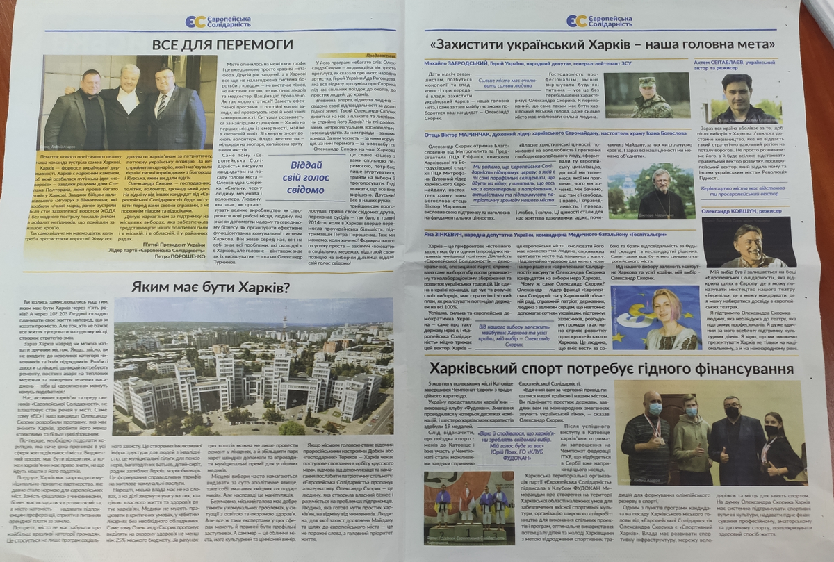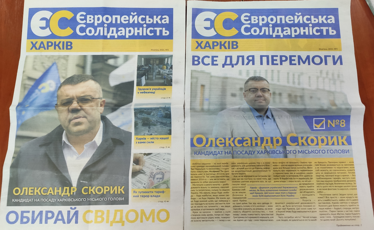 Також у жовтні вже вийшли два номери друкованої продукції «ЄС. Європейська солідарність. Харків». Замовником є кандидат на посаду міського голови Олександр Скорик.