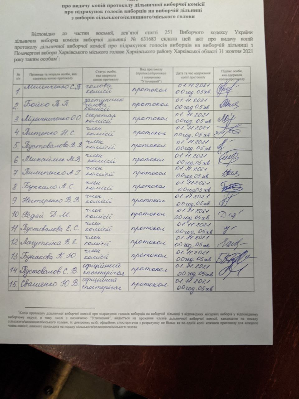 Так, члени ДВК №631683 на протоколі поставили дату 1 листопада, хоча де-факто протокол підписали ще 31 жовтня.