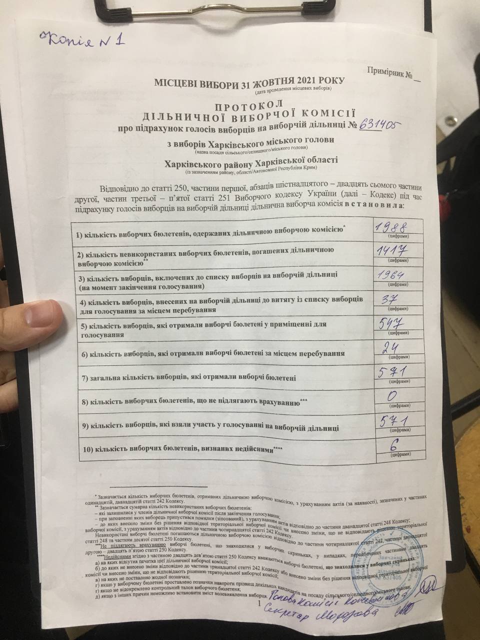 Члени вже двох дільничних виборчих комісій у Харкові підписали свої протоколи про підсумки голосування не фактичним часом складання документу, а майбутнім числом. Про це повідомляють спостерігачі Громадянської мережі ОПОРА з місця подій.