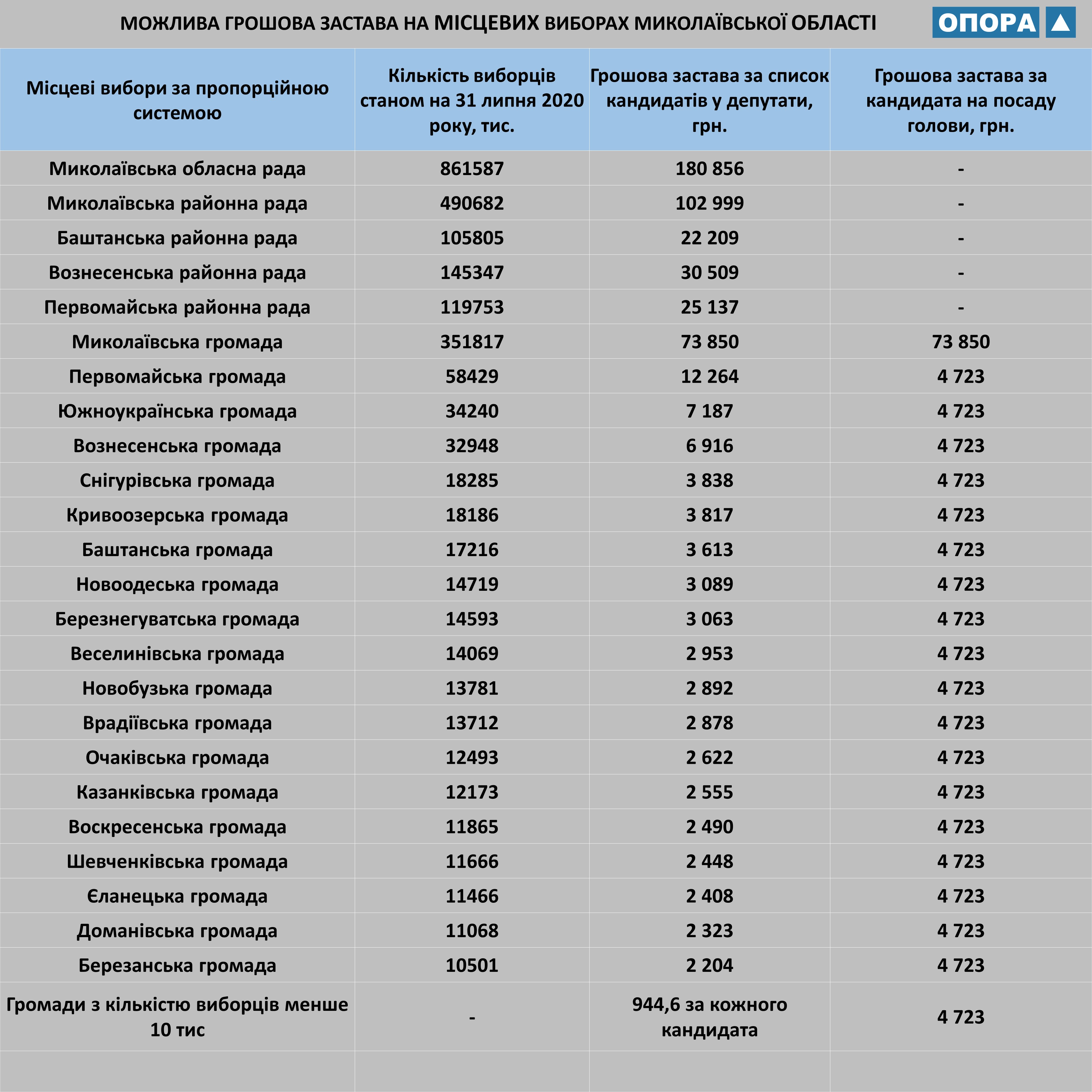 Згідно з аналізом ОПОРИ щодо кількості виборців в обласних, районних радах та територіальних громадах станом на 31 липня 2020 року та поточного розміру мінімальної заробітної плати можлива грошова застава для реєстрації кандидатів у депутати становитиме: до Миколаївської районної ради – 102 999 грн, Миколаївської об’єднаної громади – 73 850 грн, Вознесенської районної ради – 30 509 грн, Первомайської районної ради – 25 137 грн, Баштанської районної ради – 22 209 грн, Первомайської об’єднаної громади – 12 264 грн, Южноукраїнської об’єднаної громади – 7 187 грн, Вознесенської об’єднаної громади – 6 916 грн тощо.