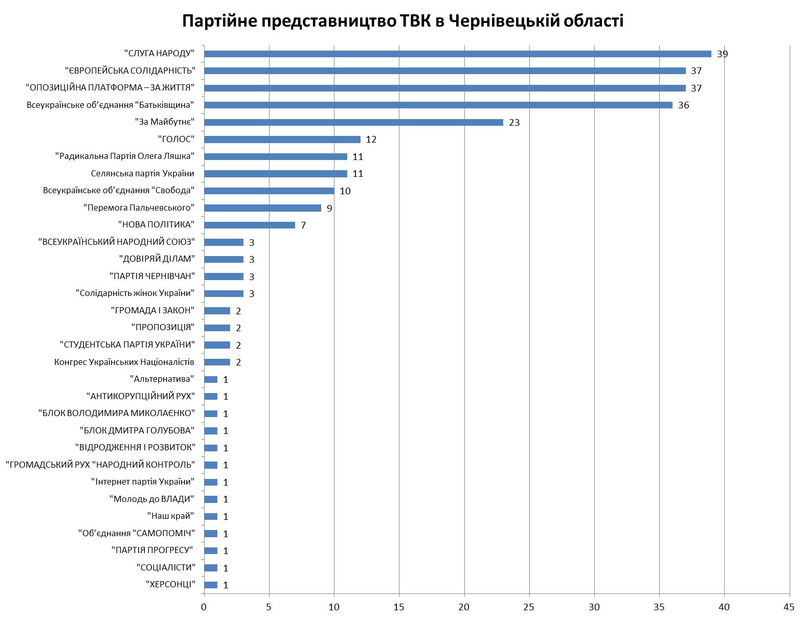 Найбільшу кількість своїх представників у ТВК матиме політична партія «Слуга народу» – 39 осіб. «Європейська Солідарність» та Опозиційну платформу «За життя» представлятимуть по 37 осіб з цих політичних сил, а ВО «Батьківщину» – 36 осіб. Ці політична сили мають по 2-3 своїх представників у всіх ТВК Чернівецької області. Інші партії отримали таке представництво: «За майбутнє» – 23, «Голос» – 12, Радикальна Партія Олега Ляшка – 11, «Селянська партія України» – 11, Всеукраїнське об’єднання Свобода» – 10, «Перемога Пальчевського» – 9, «Нова політика» – 7. Решта політичних партій має по три та менше політичних представників у ТВК області.