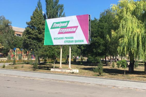 В місті Олександрія на білбордах відзначився міський голова: «Довіряй справам. Міський голова Степан Цапюк». Реклама розміщена на фоні трьох кольорів – білий, зелений та рожевий.