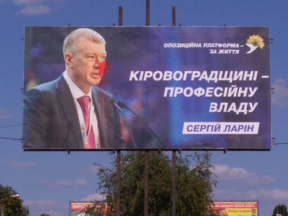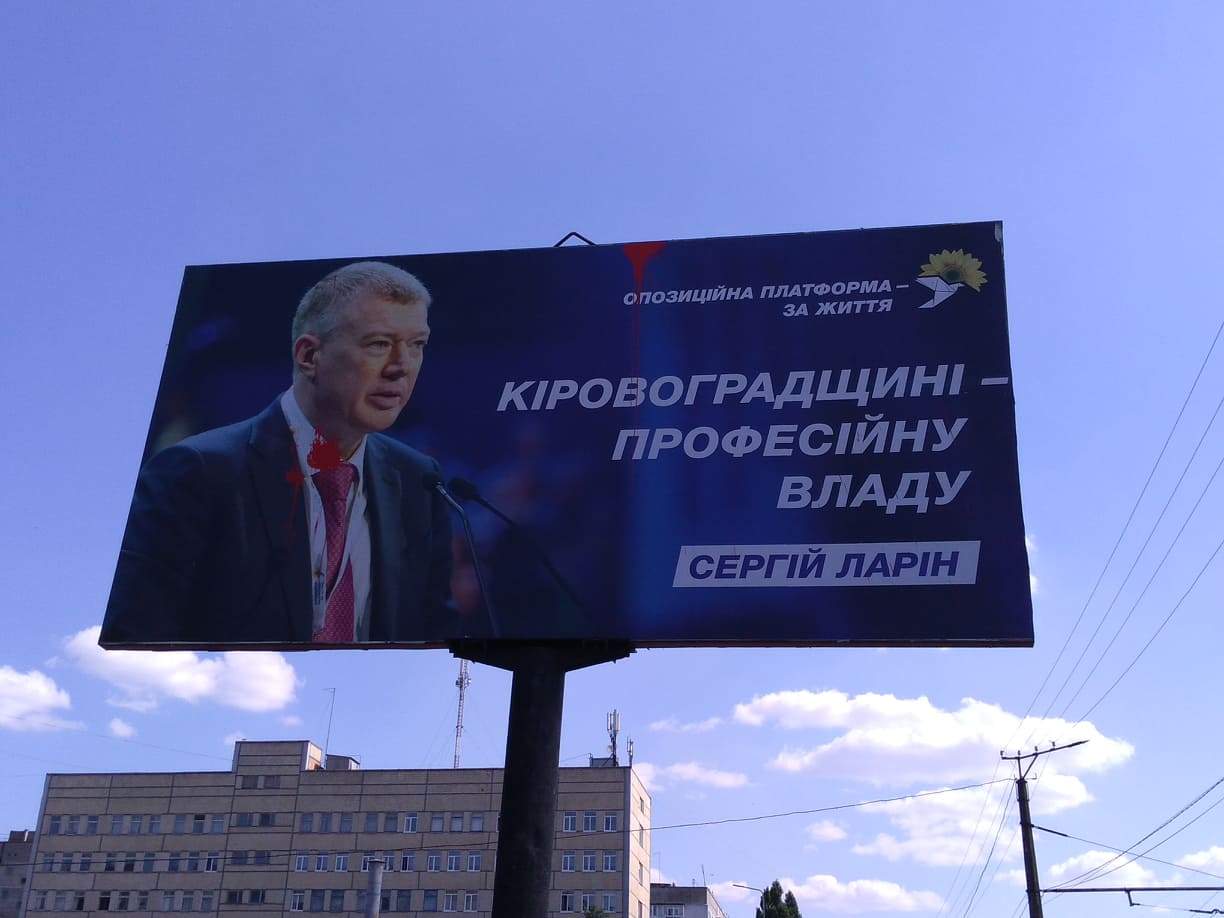 Зображення ексголови Кіровоградської ОДА, нардепа та керівника обласної політичної сили «Опозиційна платформа – За життя» Сергія Ларіна облили ймовірно червоною фарбою Пошкодження білбордів зафіксовано у Кропивницькому та Світловодську. На зовнішній рекламі розміщено слоган «Кіровоградщині – професійну владу», а також зазначено назву партії.
