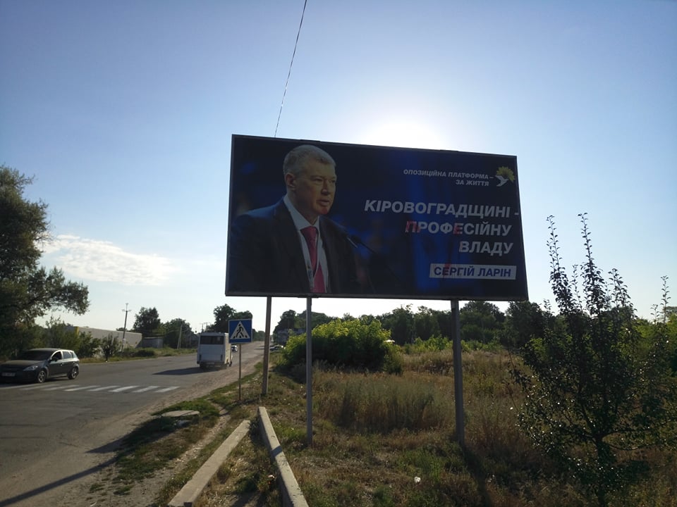 На Кіровоградщині представники ОПОРИ у серпні зафіксували зовнішню рекламу 7 політичних партій. А у Кропивницькому та Світловодську таку рекламу вже зіпсували: білборди народного депутата України та керівника обласної організації політичної партії «Опозиційна платформа – За життя» Сергія Ларіна облили фарбою.