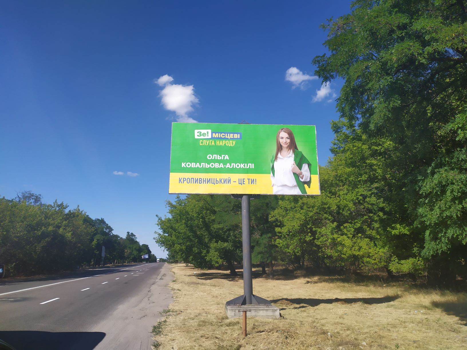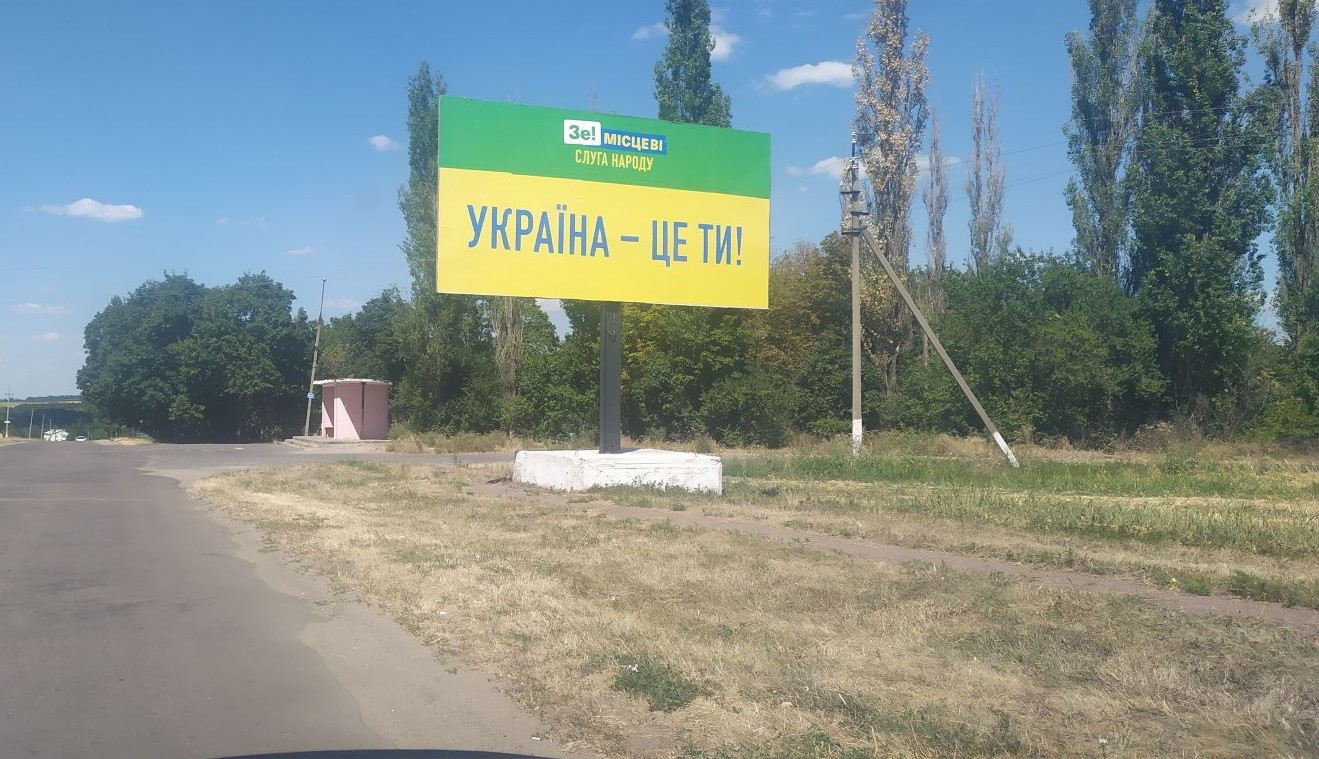 Партія «Слуга народу» на білбордах використовує жовто-зелений фон, а також напис «Україна – це ти!» Зе! місцеві, Слуга народу». У Кропивницькому також з’явилися білборди із зображенням ймовірної кандидатки на посаду міського голови від цієї партії Ольги Ковальової-Алокілі. На них розміщена світлина претендентки із зеленим светром та напис «Кропивницький – це ти!».