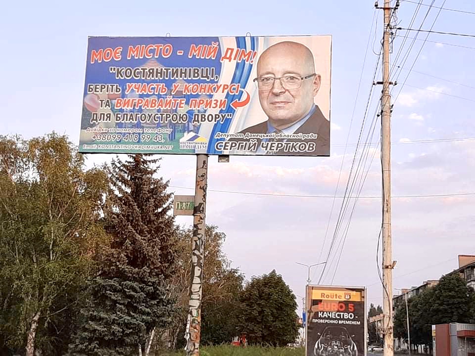 У місті Костянтинівка на плакатах Сергія Черткова, на яких зазначено, що він є депутатом Донецької обласної ради, спостерігачі зафіксували написи із запрошенням взяти участь у конкурсах та відвідати концерт духового оркестру. Окремо у місті розташовано білборди Соціальної ініціативи Сергія Черткова із зображення самого депутата і написом: «Для підтримки літніх людей «Соціальна стоматологія» і контактним телефоном для звернень.