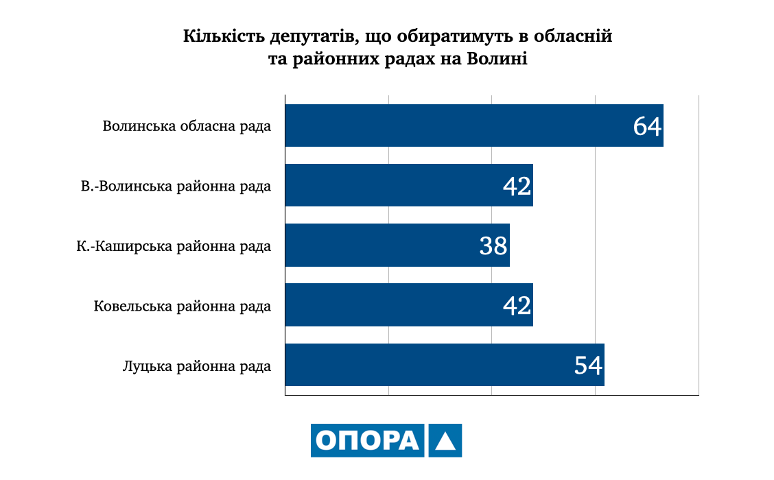 Відтак, проголосувати за склад  Волинської обласної ради можуть 756 тис. 549 волинян, тож рада складатиметься із 64 депутатів. За склад Володимир-Волинської міської ради голосуватимуть 126 490 виборців, а Ковельської – 199 499 виборців, що дасть змогу сформувати склади по 42 депутати. Натомість Луцька районна рада із 335 639 осіб може розраховувати на 54 депутатів, а Камінь-Каширська із  94 921 виборцем – на 38 депутатів. Тож загалом до цих рад оберуть 240 депутатів.