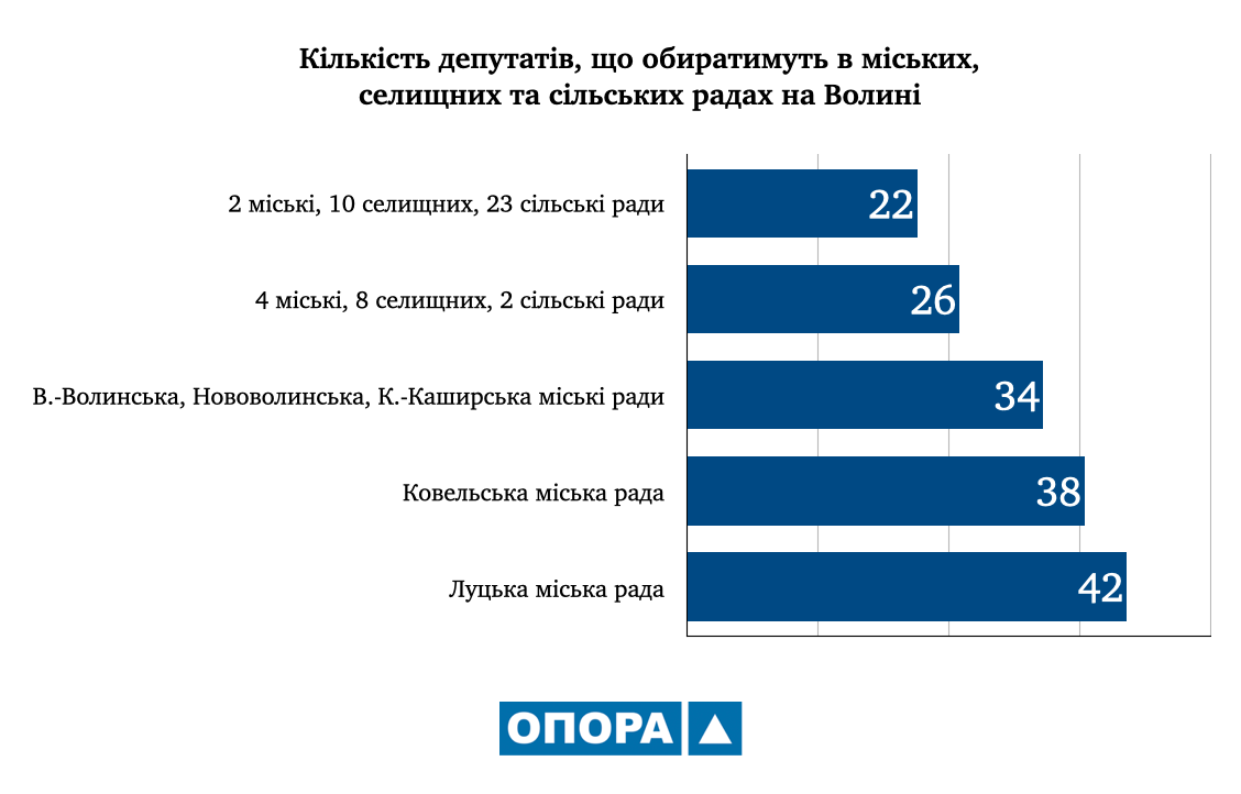 На Волині 35 сільських, селищних та міських громад, котрі мають чисельність населення менше 10 тис. виборців. Їхні місцеві ради будуть включати по 22 депутати, а вибори відбудуться за мажоритарною системою відносної більшості в багатомандатних виборчих округах.