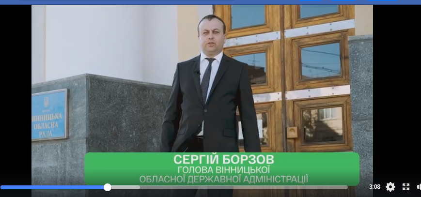 У відеоролику на 01:21 секунді голова ОДА Сергій Борзов говорить: «Ми реалізовуємо президентську програму «Велике будівництво». По всій області будуються дороги. Сьогодні проводимо капітальний ремонт ста кілометрів. Будують мости та сільські дороги. Завдяки президентській програмі на Вінниччині відкриють оновлені дитячі садки, школи та спортивні споруди. На це з державного бюджету виділено понад 144 мільйони гривень. Не зупиняємося. Будуємо разом».