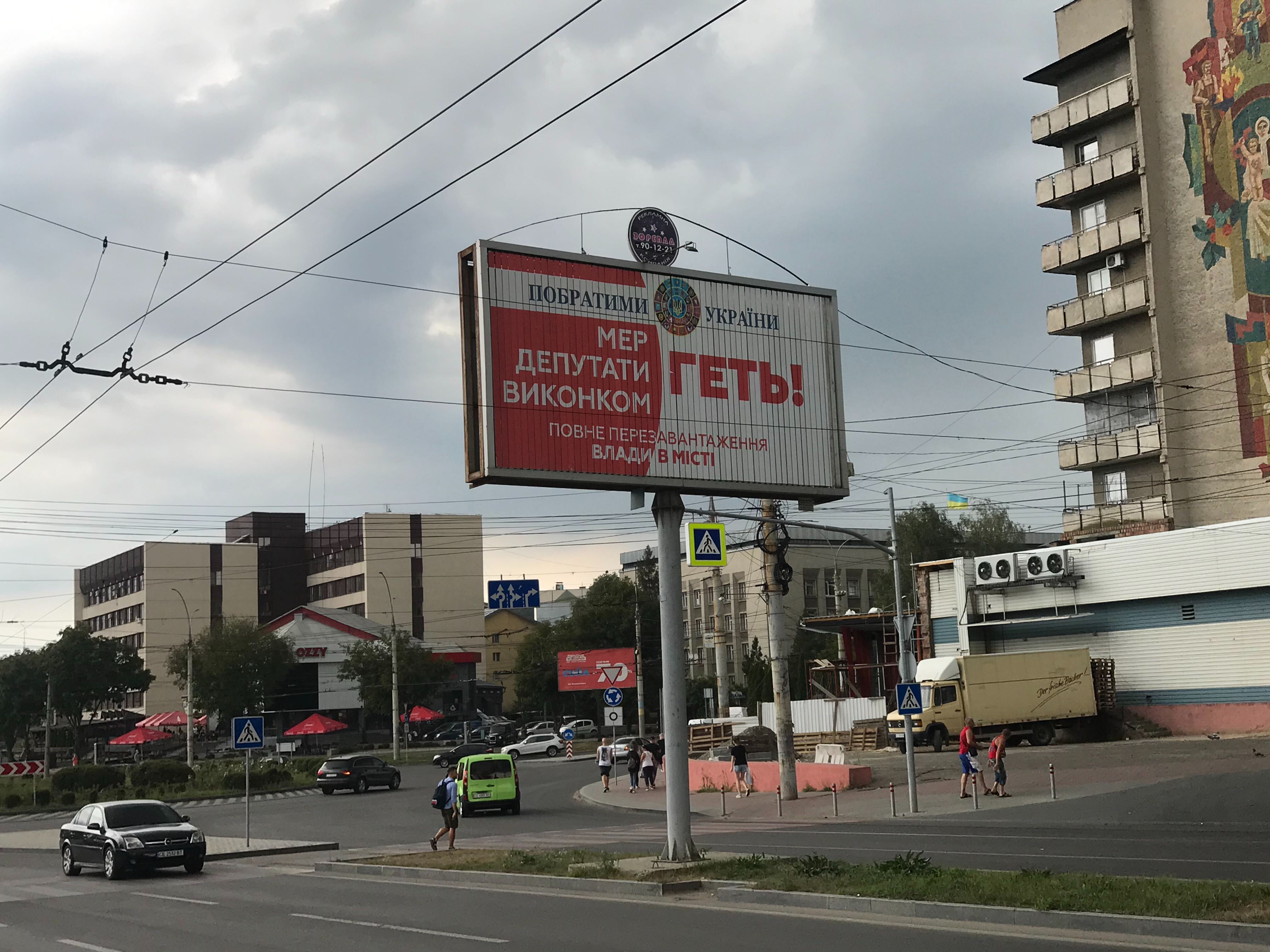 Зафіксовано також білборд ГО «Побратими України» із гаслом: «Мер, депутати, виконком  —  геть! Повне перезавантаження влади».