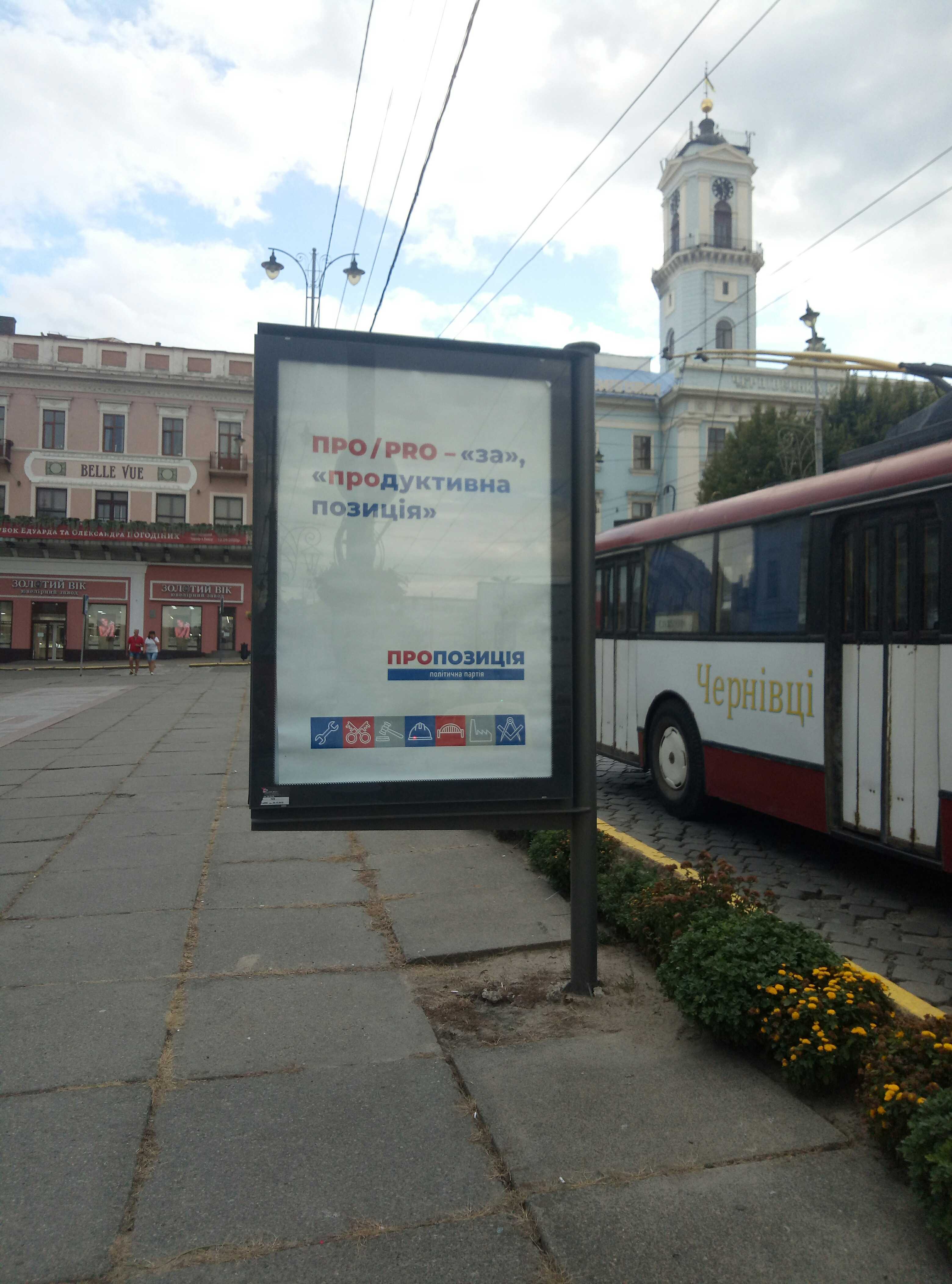 Із фразою: «ПРО/PRO – «за»,  «продуктивна позиція»,  розміщена політична реклама політичної партії «Пропозиція».